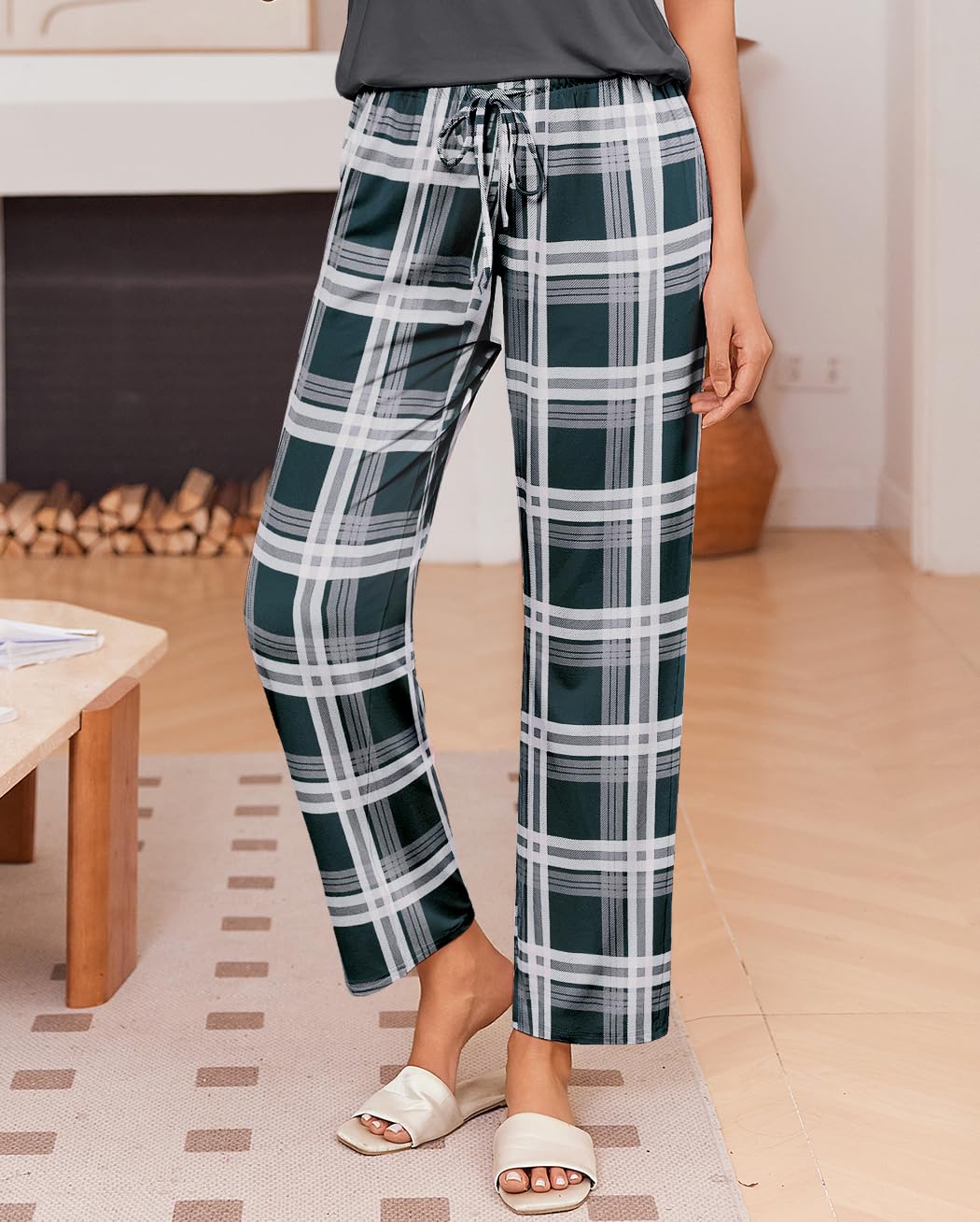 2 Piece Pj Sets: PAJAMA TOP is solid color round neck; Pajama Bottom is plaid long pants with pockets and waistband, classic and practical 2 piece lounge sets that fit your body curves for comfort and relaxation