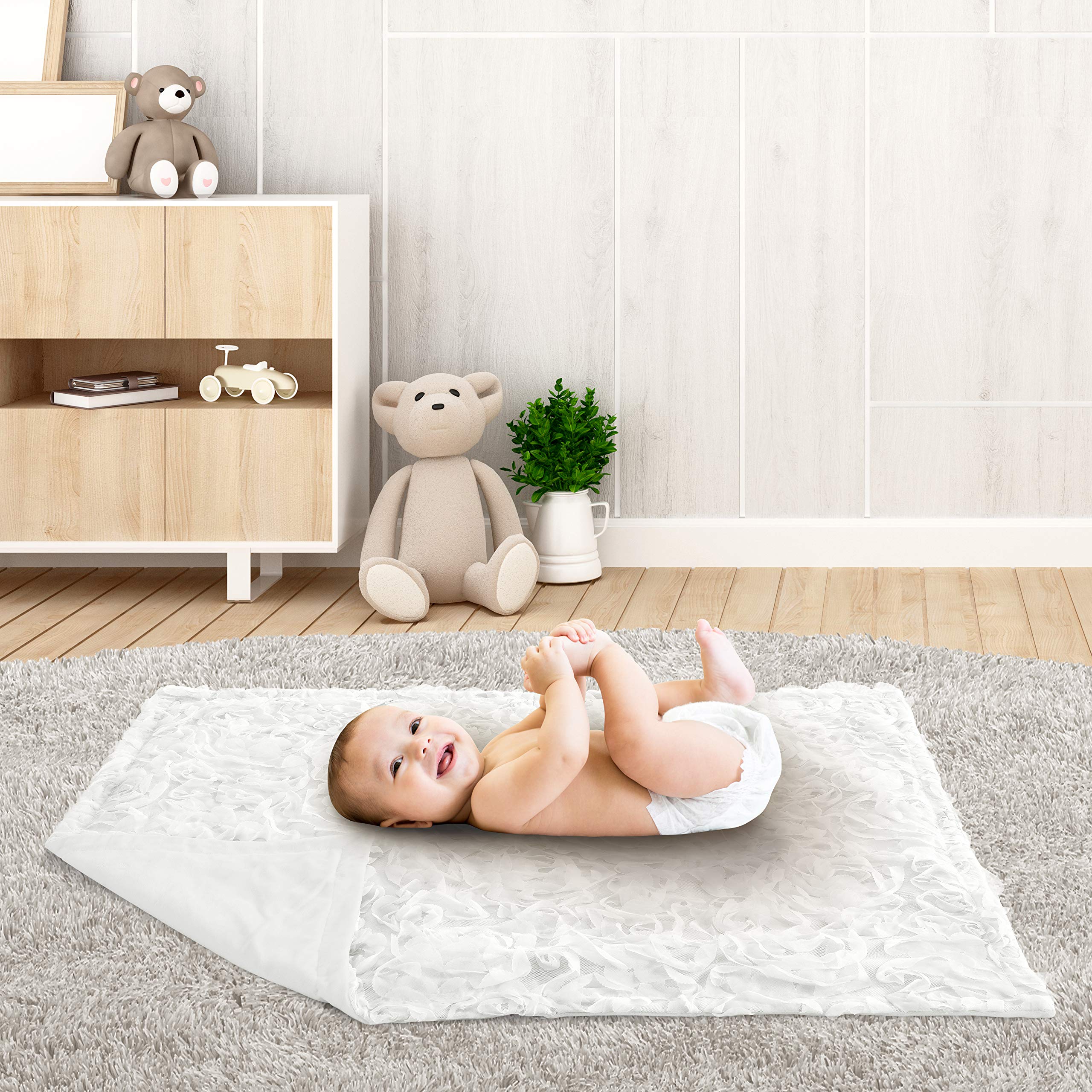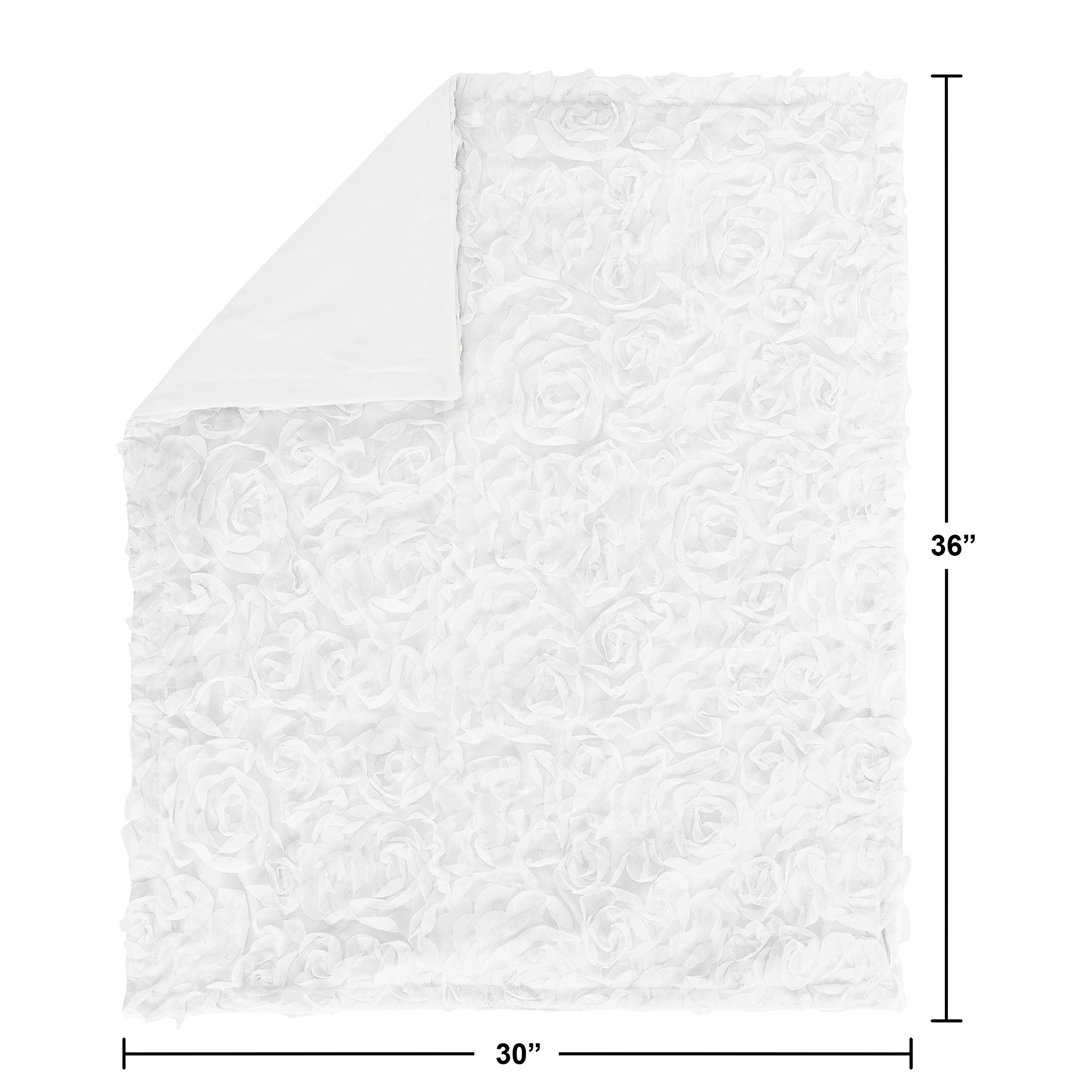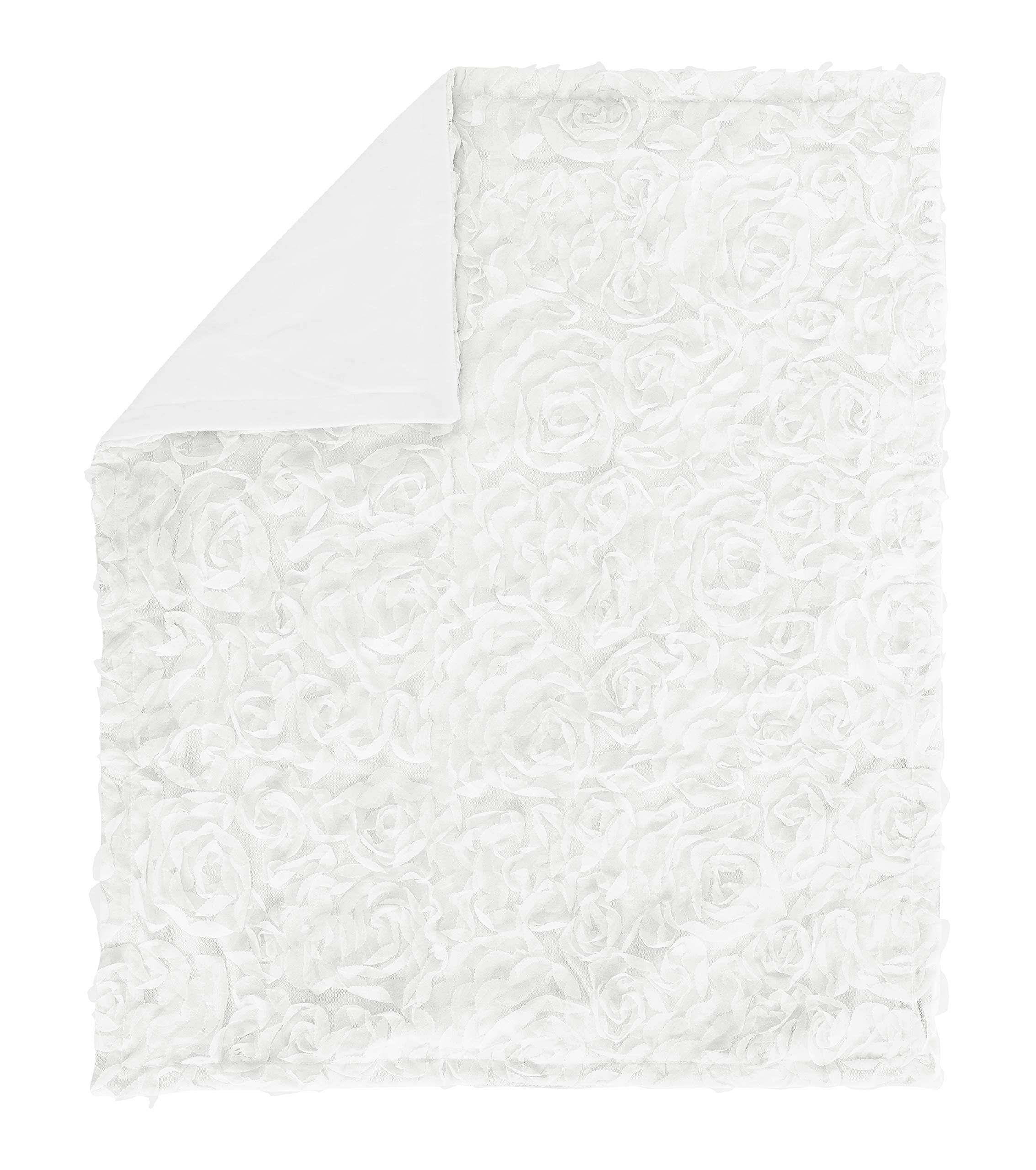 Blanket is designed using white Chiffon Floral Rose and reverses to soft white minky
