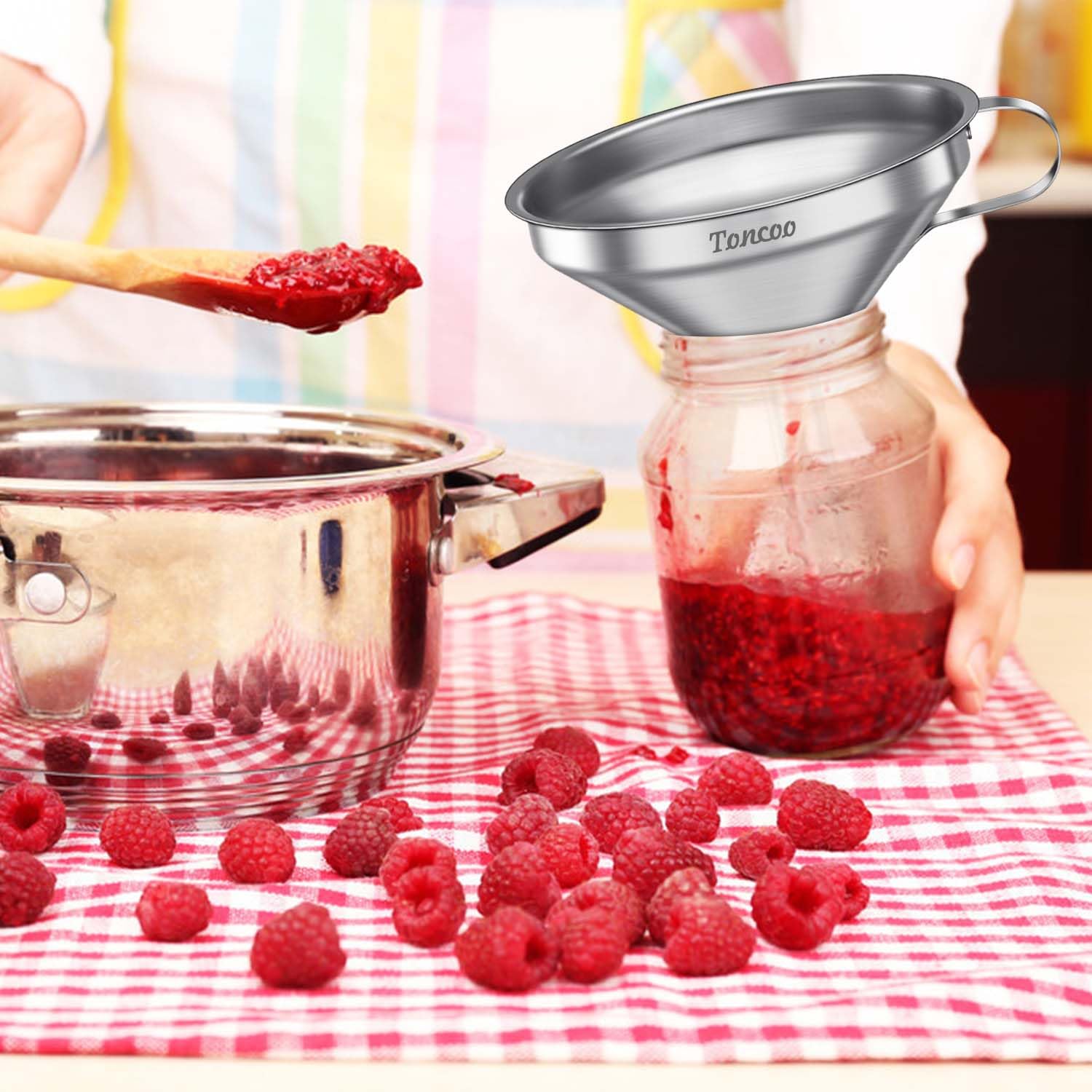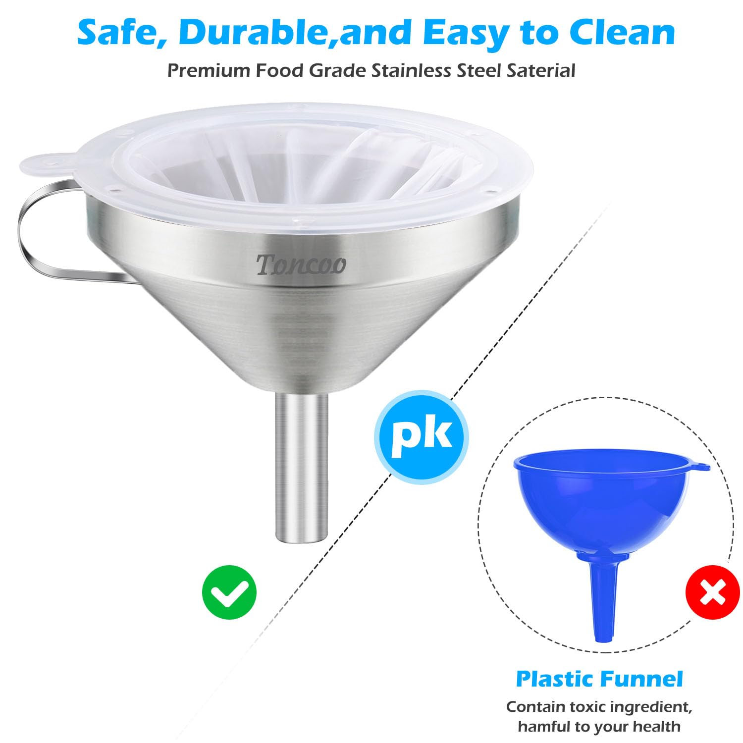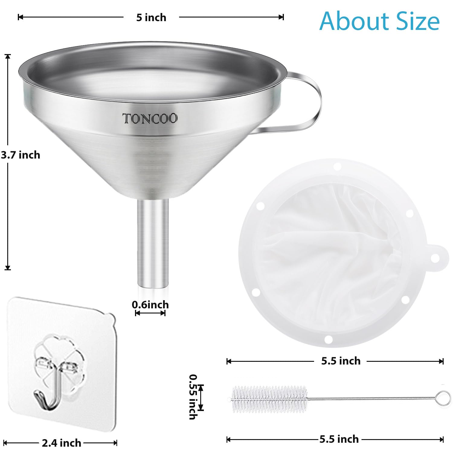 Tired of a messy kitchen and feel powerless to transfer liquid or solid food? Well, It's Time to Get Yourself A Set of Premium Stainless Steel Funnels! Toncoo is a professional company committed to creating innovative and practical kitchen tools for all people. We use top-quality Food Grade stainless steel and humane design to create this gorgeous metal funnel set, hoping it can help you to improve efficiency while cooking. Specification: 1. Cooking oil filter Material: Food-Grade Stainless Steel 2. Oil strainer Color: Silver 3. Apothecary suppliesl Dimension: 5 inches diameter, 3.7 inches tall, 1.8 inches long stem, diameter of the spout is 0.6 inches. 4. Milk strainer Dimension: 5.5 inches diameter 5. Brush & Hook Dimension: Brush 5.5 inchs long, 0.55 inches width; Hook 2.4 inches diameter 6. Package Information: 1 x Premium Metal Funnel, 1 x 200 Mesh Filter, 1 x Cleaning Brush, 4 x Sticky Hooks Why Choose Toncoo's Funnels for Kitchen Use Filling Bottles? - Made of food-grade Premium stainless steel, 100% safe and much durable. - Funnels for Filling Bottles humane handle for easy use and storage. - Air release channel allows the outflow of air in order to fill liquid faster. - Comes with 200 mesh funnel strainer for filtering. - The stylish appearance that can match all of the home decoration styles.