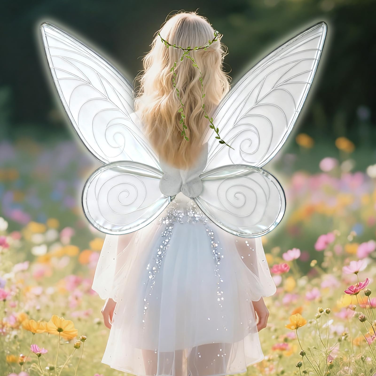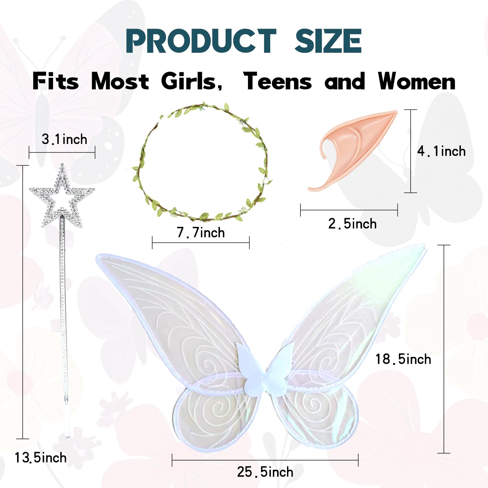 Complete 4PCS Fairy Costume Set:Includes iridescent butterfly fairy wings, a star wand, floral vine crown, and a pair of soft elf ears—everything kids, teens and women need to transform into a magical fairy.