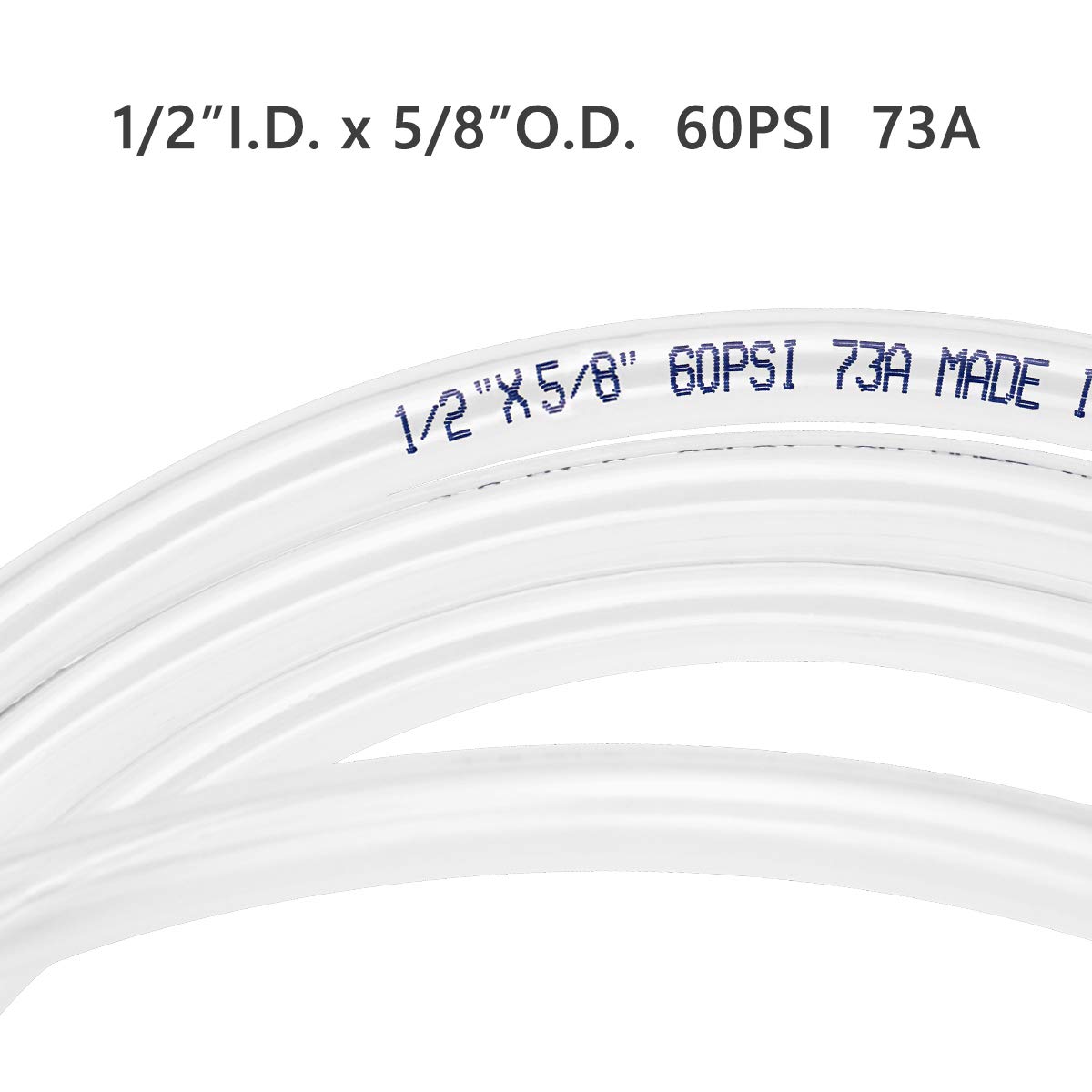 Tubing Details - PVC vinyl tubing, ID: 1/2", OD: 5/8", 10 feet, Wall thickness: 1.6mm; Hardness: 73A (firm); Temperature Range : 23°F to 149°F (-5°C to 65°C); Working Pressure: 60PSI