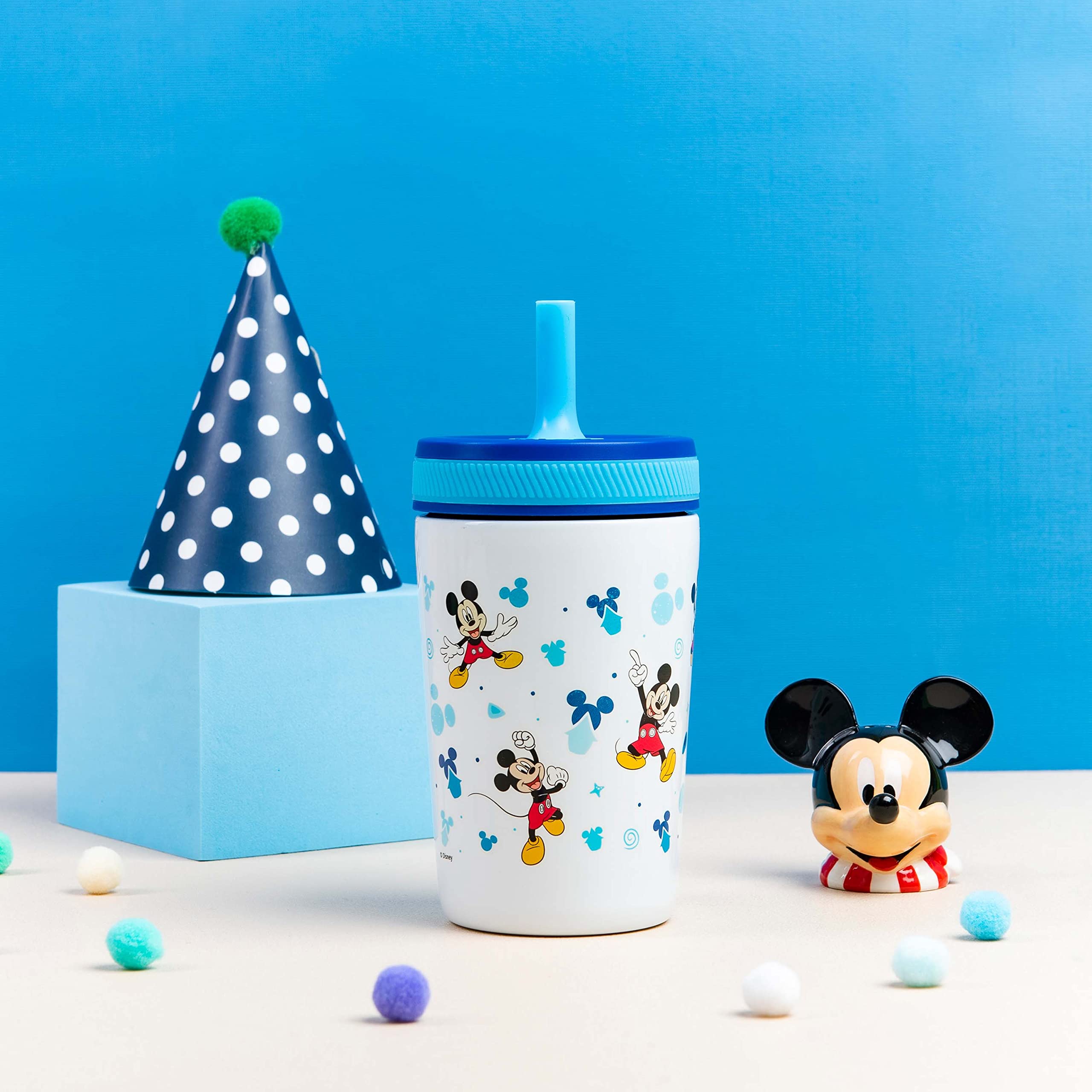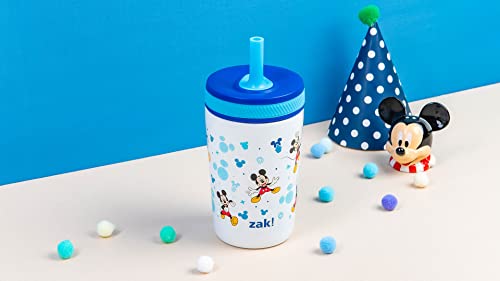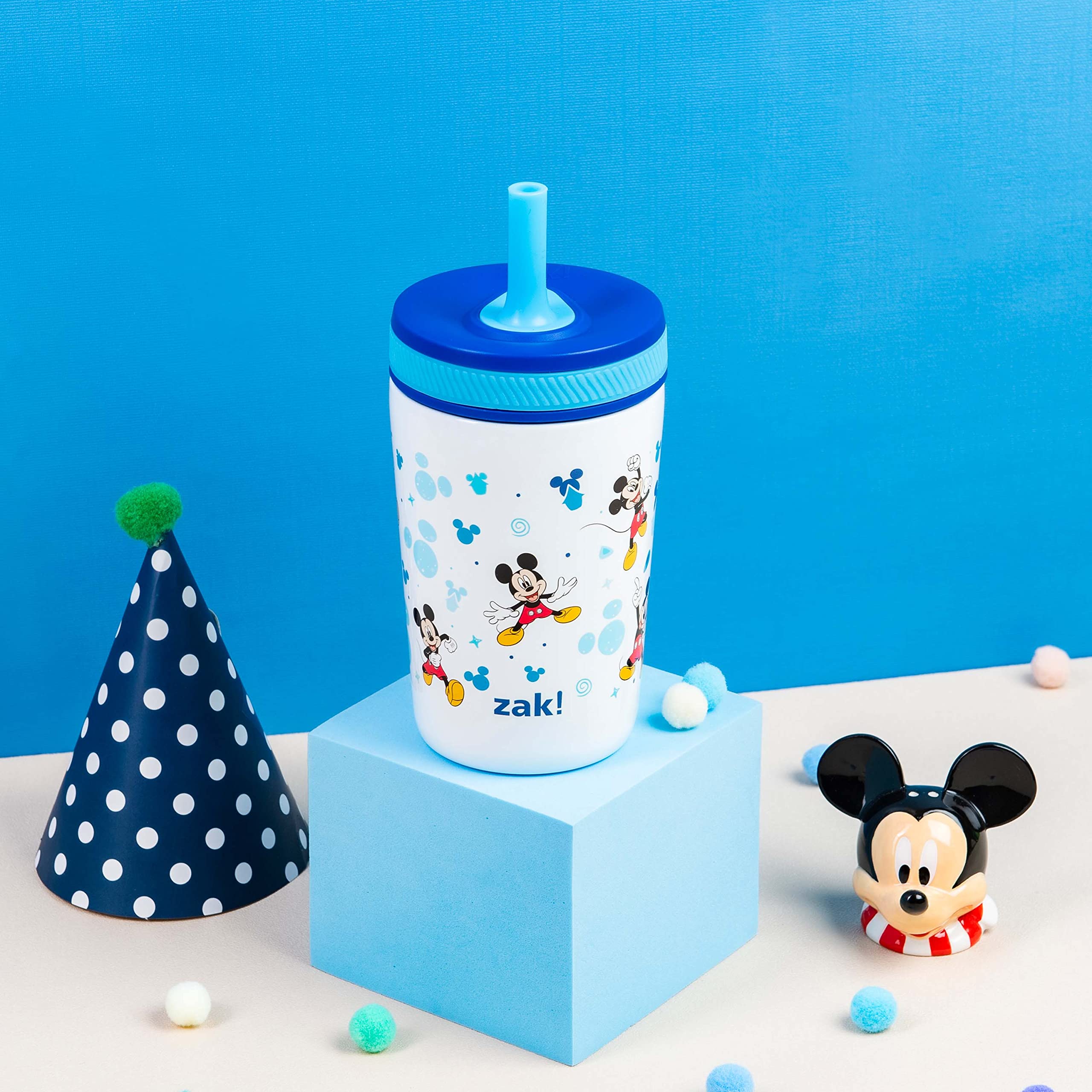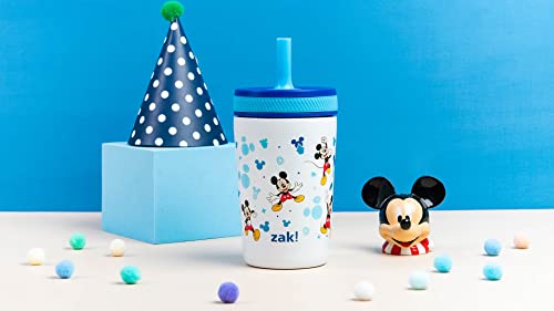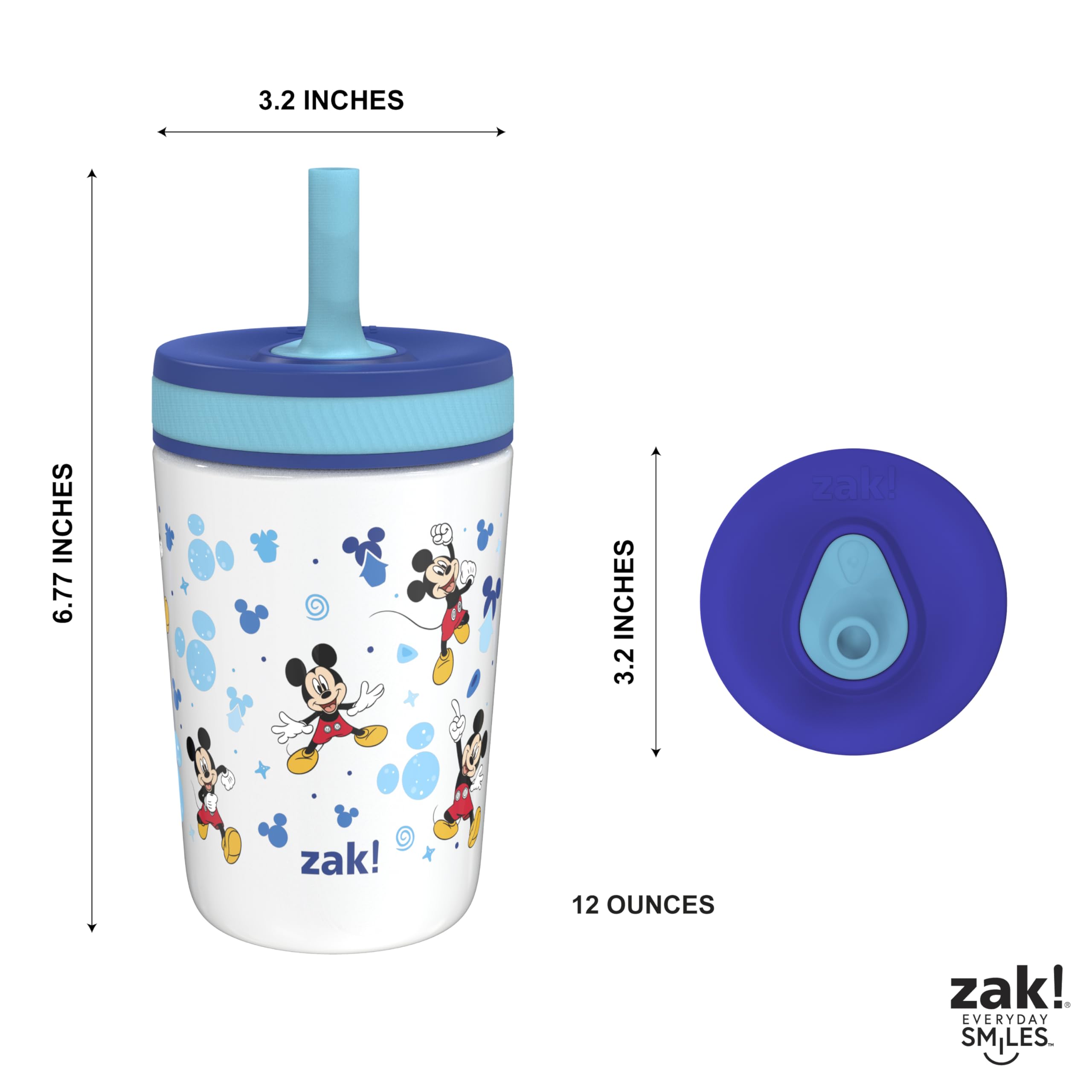 This leak-proof tumbler from Zak Designs makes hydration fun for any Disney fan! Durable Materials: The tumbler is made from food-grade, 18/8 stainless steel, and the comfortable straw is made from silicone. Everything is completely BPA free, and the lid can be disassembled for easy cleaning. Leak-Proof Straw: The straw spout has a built-in valve that allows liquid to flow when drinking and prevents spills when the tumbler is tipped over. It's perfect for travel or for young children graduating from sippy cups. Vacuum Insulation: The stainless steel tumbler has vacuum insulation that keeps drinks cold for up to 10 hours, so your water is always refreshingly chilled. The double-wall construction also prevents condensation from forming on the outer walls, eliminating messy water rings.Hydrate Anywhere: The tumbler won't splash or leak and fits in car cup holders, making it ideal to take on the go. At home, you don't have to worry about spills or stains around fabrics or electronics, and drinks stay easily accessible through the straw. Specifications: 12 oz capacity. Vacuum insulated. Made of durable stainless steel and silicone. BPA-Free - Zak is committed to safety. Hand wash tumbler, top rack dishwasher safe, do not microwave. Length: 3.2-inch, Width: 3.2-inch, Height: 6.77-inch. Character: Disney's Mickey Mouse.