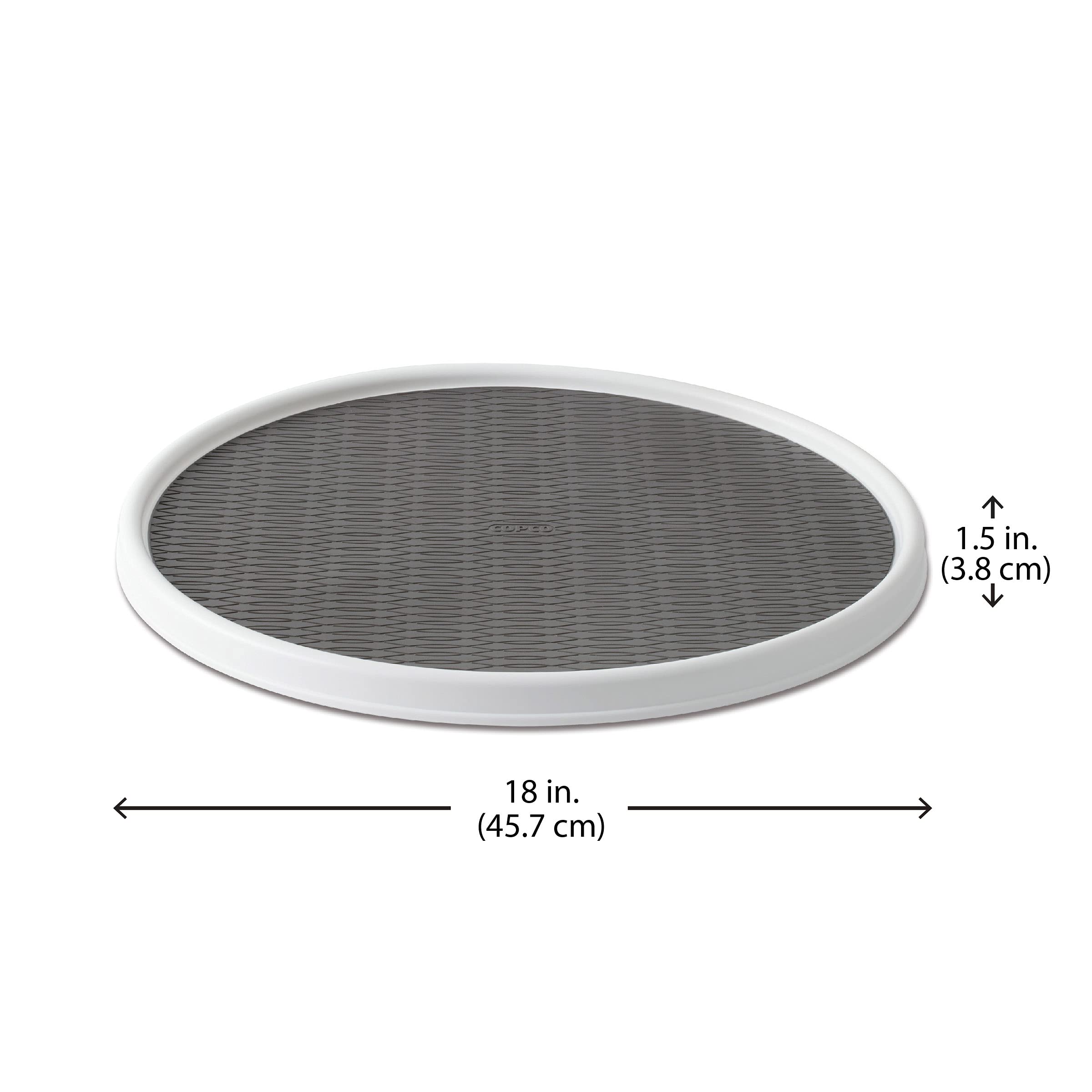 The Copco Turntable is great for countertops, under the sink, laundry rooms, pantries, garages and more. This handy non-slip turntable keeps everything you need within easy reach. Its raised, 3/8-inch rim also prevents items from falling off the turntable. Easy-glide, revolving storage space maximizes cabinet space and keeps kitchen organized and tidy. Exterior measurements 1-1/2 inch x 18 inch diameter; interior space is approx. 1 to ½ inch smaller.