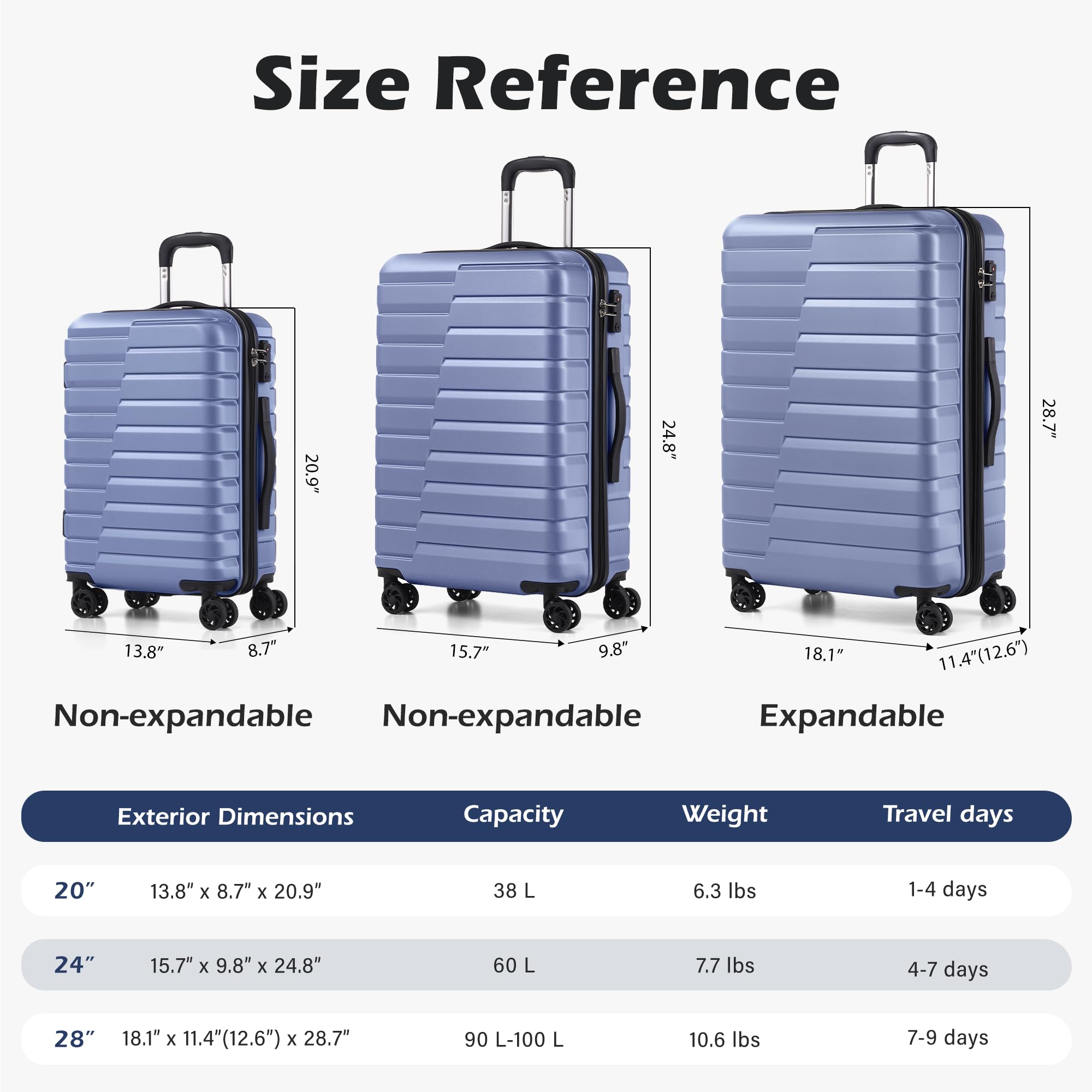 3 Piece Luggage Set: The 20-inch carry-on and 24-inch medium suitcase are standard models and do not have expansion functions. The 28-inch suitcase is expandable, offering 15% additional capacity. Capacity: 20-inch (38L, non-expandable), 24-inch (60L, non-expandable), 28-inch (90L, expandable).Suitable for family trips and long-distance travel.