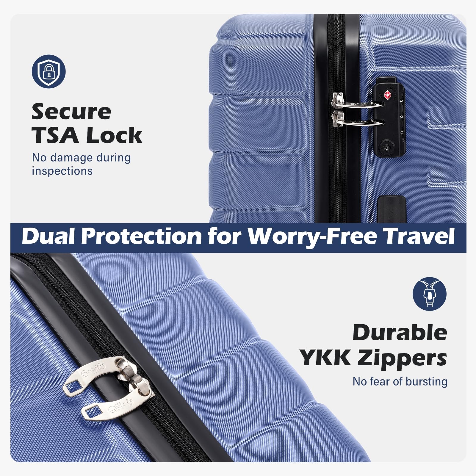 TSA Lock & YKK Zippers: This hardshell 3-piece luggage set is equipped with a TSA-approved combination lock for seamless security inspections without damage. Paired with custom YKK zippers—renowned for their durability and smooth operation—you won't have to worry about zipper jams or breaks. This dual protection keeps your belongings secure, so you can travel with peace of mind.