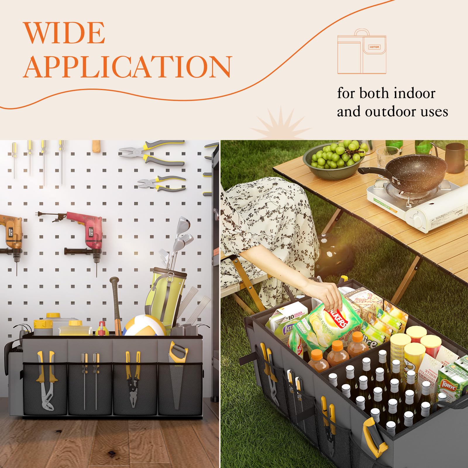CONVENIENT ACCESS: HOTOR car trunk organizer for SUV is equipped with 2 compartments and 6 stretchy mesh pockets to make items easy to see and grab when needed. No more digging around a messy trunk to find what you need. Just grab and go.