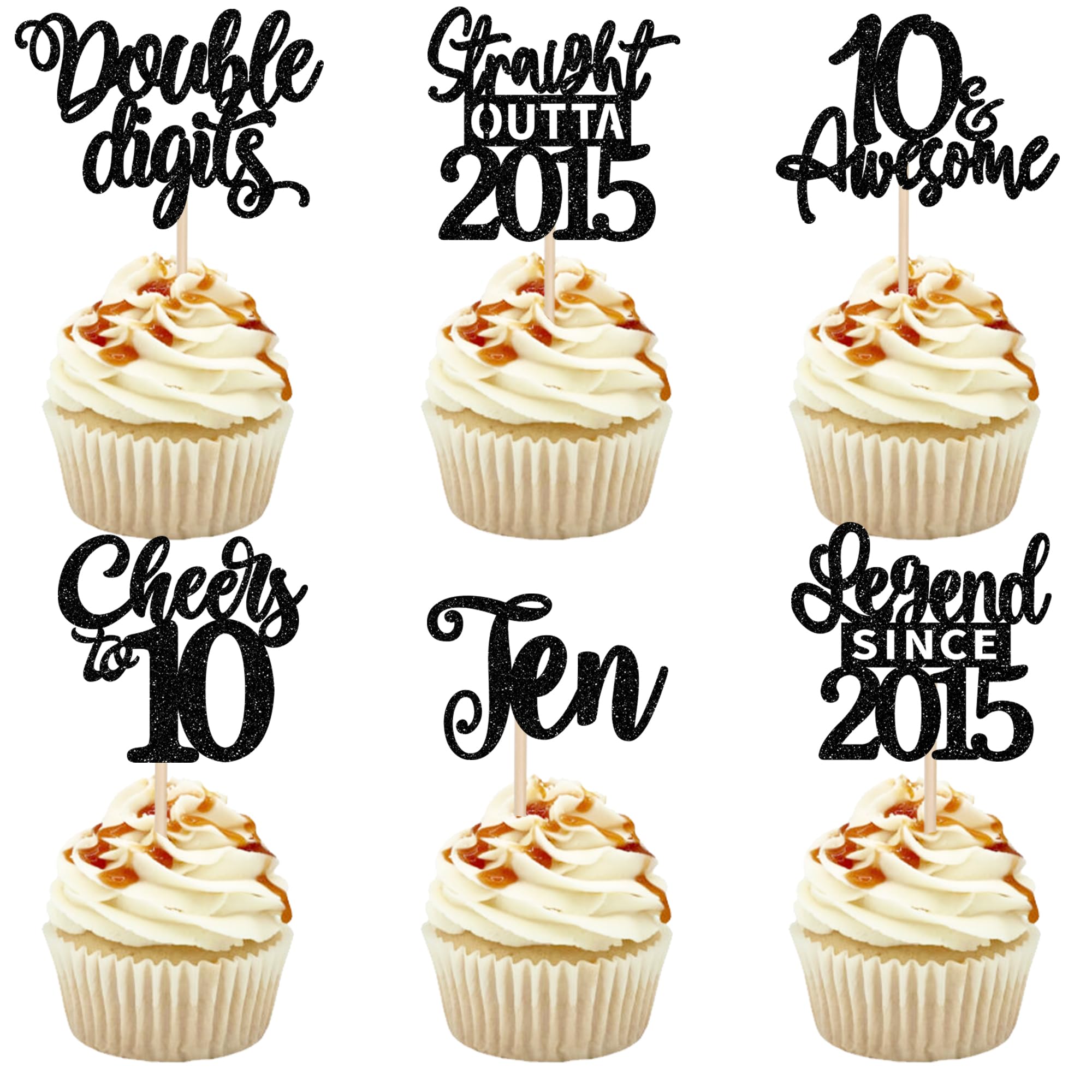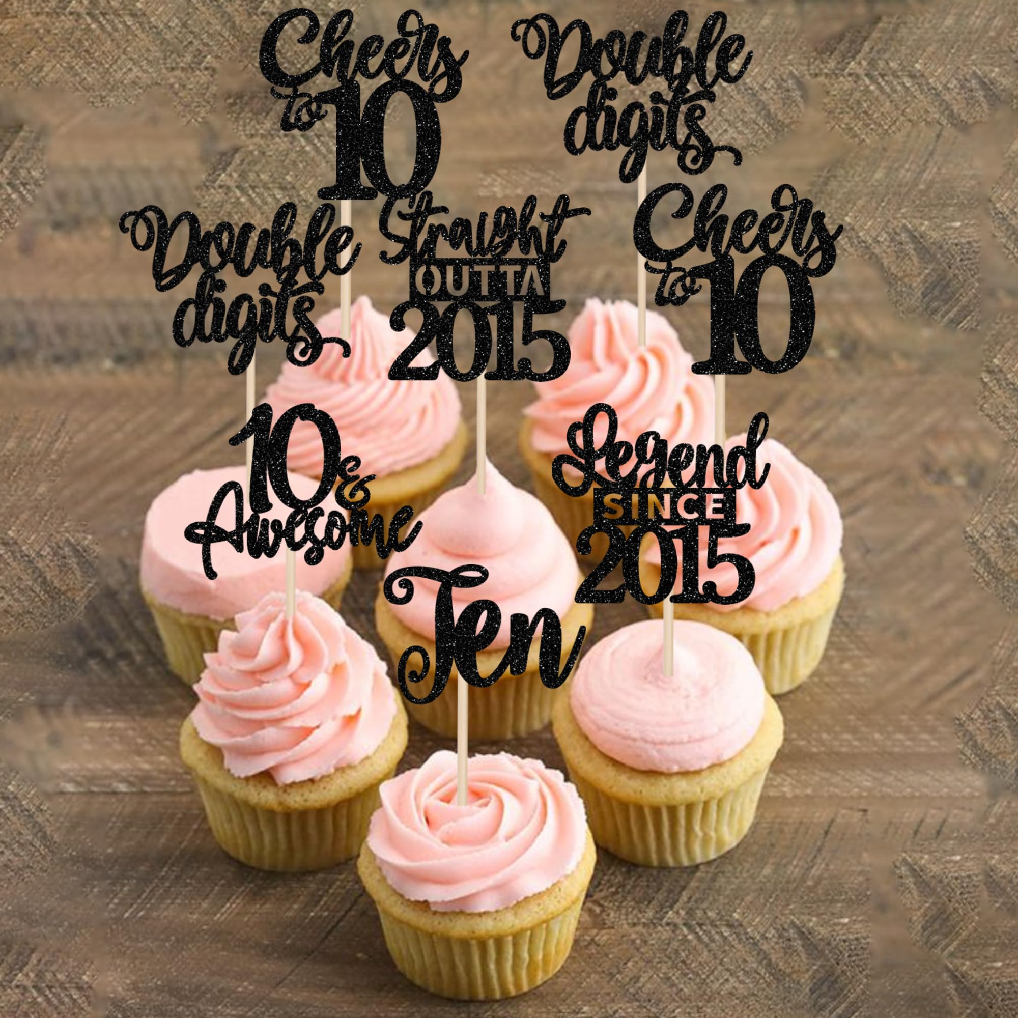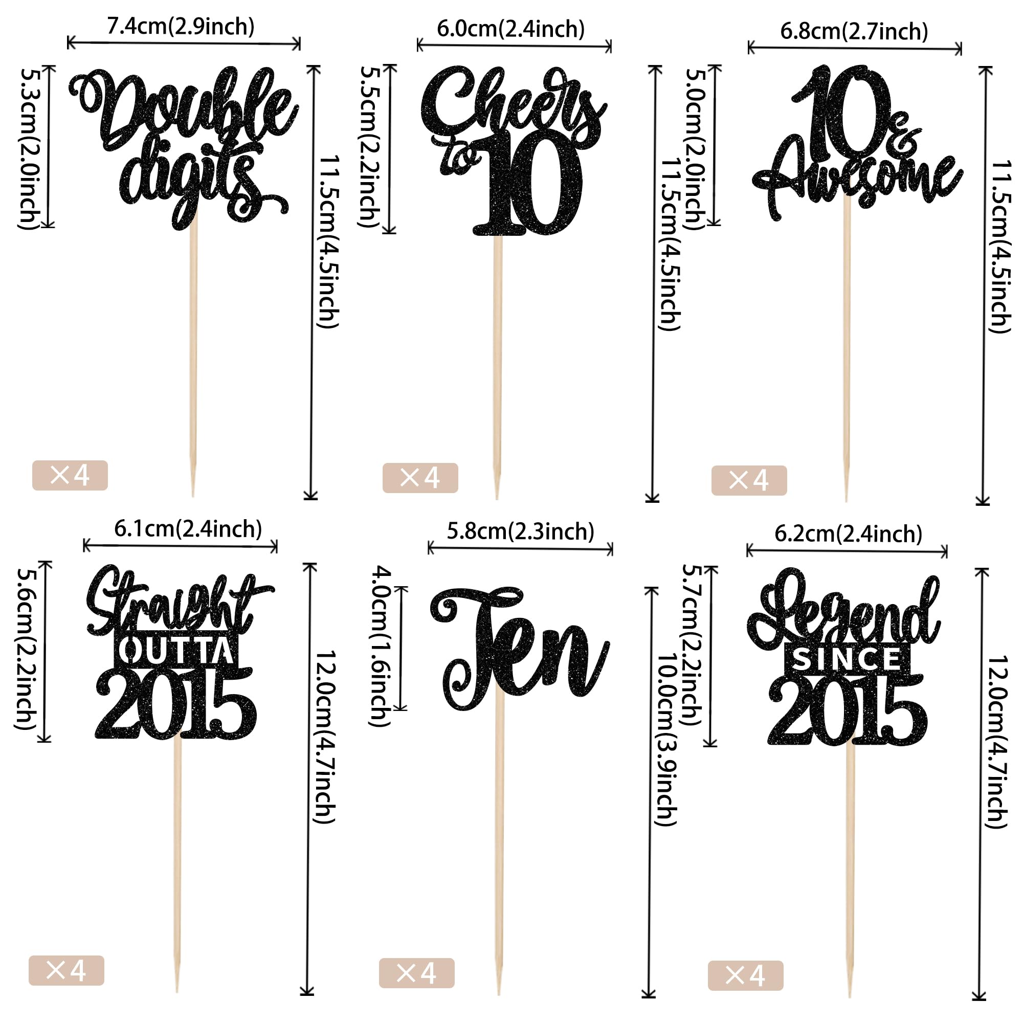 24PCS 10th Birthday Cupcake Toppers Ten Double Digits Straight Outta 2015 Cupcake Picks Cheers to 10 Lengend Since 2015 Cake Decorations for Happy 10th Birthday Anniversary Party Cake Decorations Supplies Perfect for legend since 2015 theme party, 10th anniversary theme party,cheers to 10 years theme party, 10 awesome theme party cupcake decorations supplies. Pack of 24 pcs,4 pcs of each design. The size is 2.9*4.5/ 2.4*4.5/ 2.7*4.5/ 2.4*4.7/ 2.3*3.9/ 2.4*4.7 inch ( with stick ) Made of high quality paper card stock,thick and sturdy. These straight outta 2015 cupcake toppers are one side glitter, another side is white, and they are intended for decoration only, please do not put them in oven or microwave. If the item you received has any defects, please contact us immediately. We will deal with it within 24 hours.