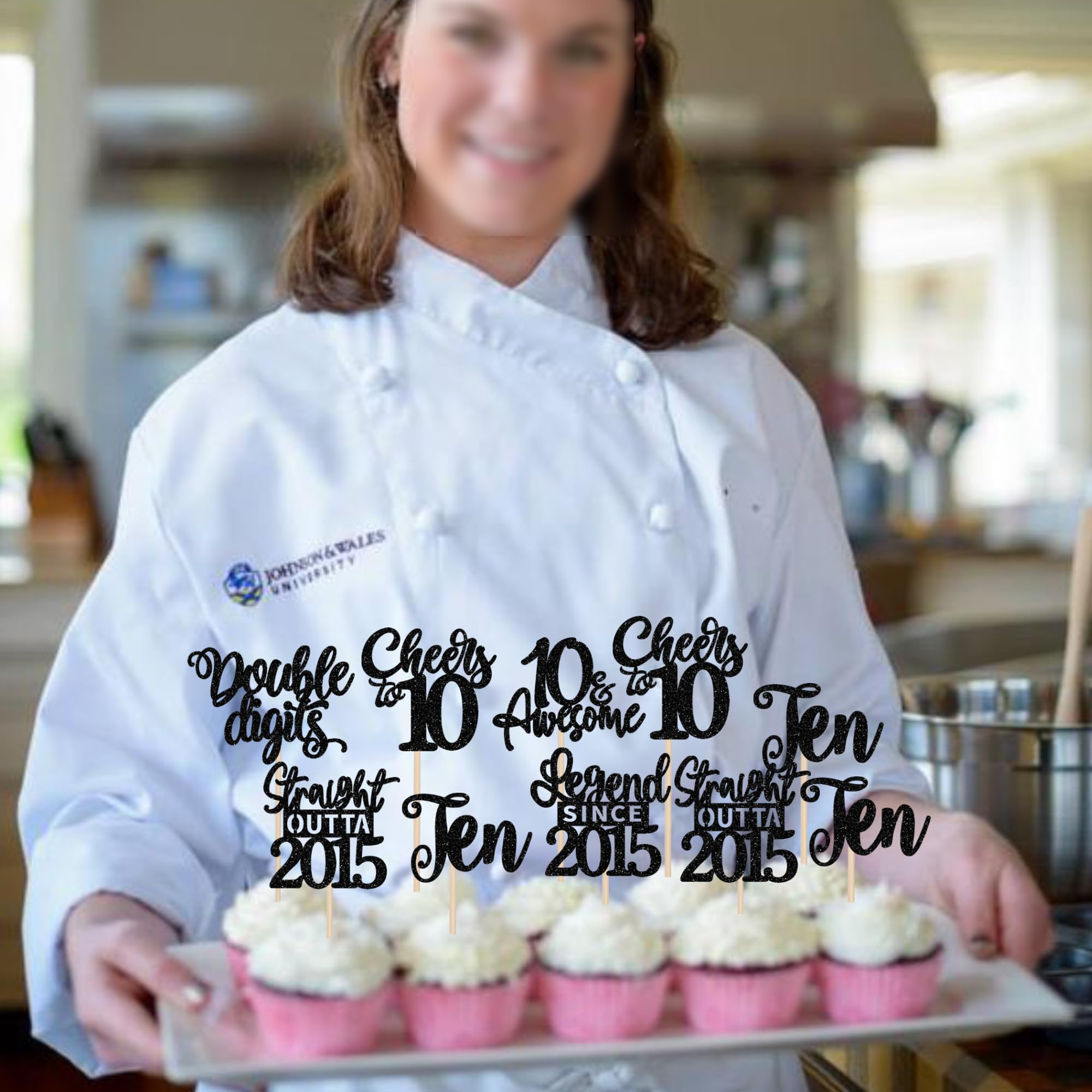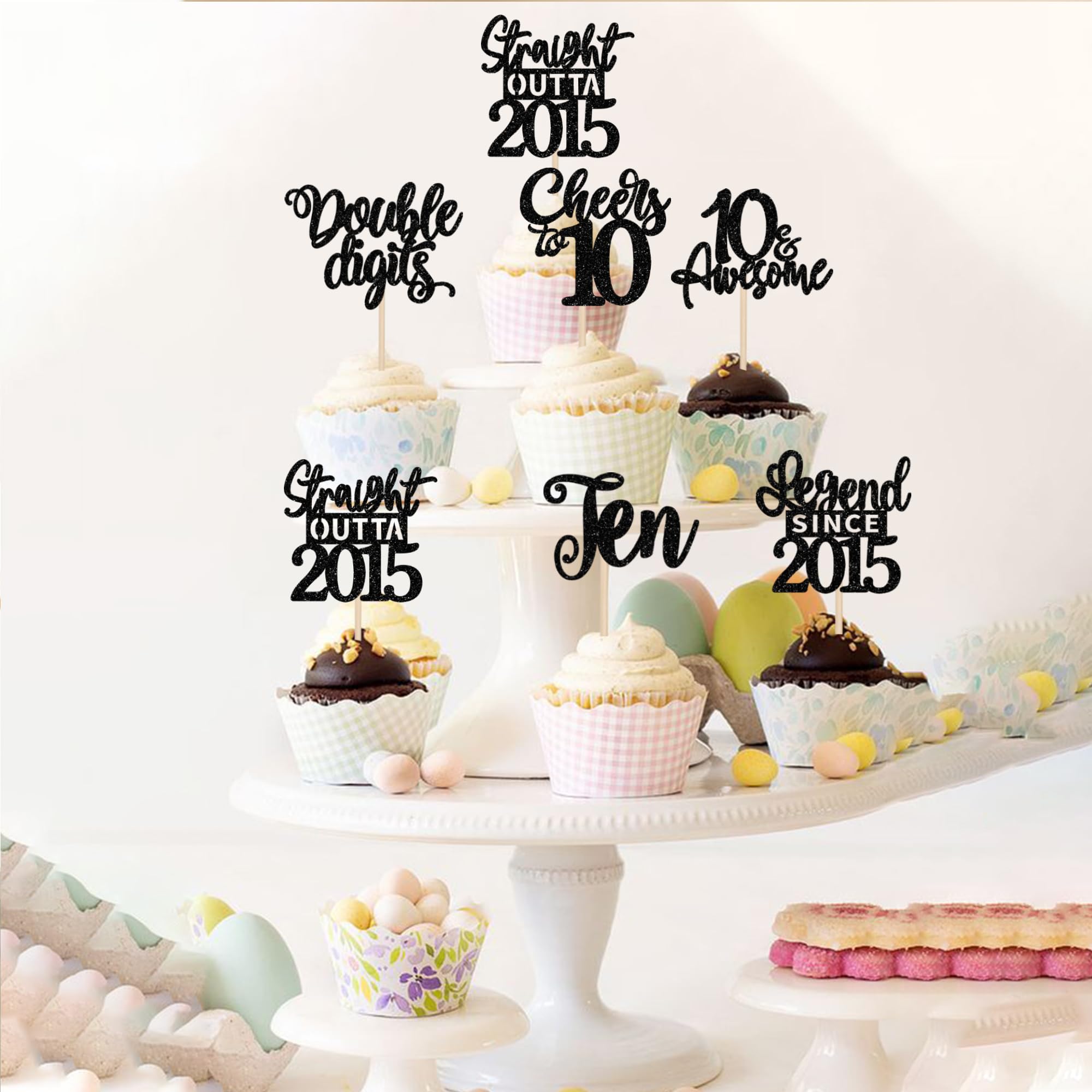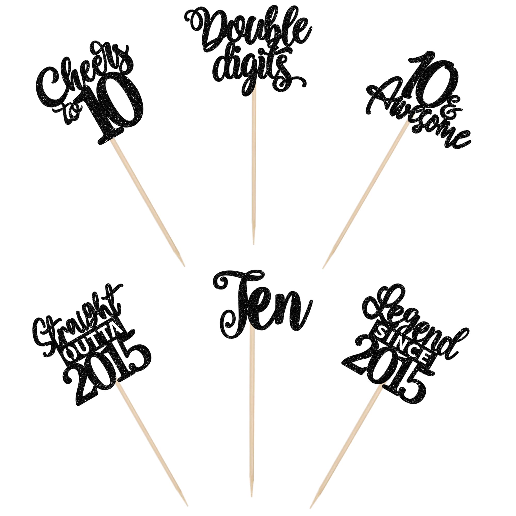 24PCS 10th Birthday Cupcake Toppers Ten Double Digits Straight Outta 2015 Cupcake Picks Cheers to 10 Lengend Since 2015 Cake Decorations for Happy 10th Birthday Anniversary Party Cake Decorations Supplies Perfect for legend since 2015 theme party, 10th anniversary theme party,cheers to 10 years theme party, 10 awesome theme party cupcake decorations supplies. Pack of 24 pcs,4 pcs of each design. The size is 2.9*4.5/ 2.4*4.5/ 2.7*4.5/ 2.4*4.7/ 2.3*3.9/ 2.4*4.7 inch ( with stick ) Made of high quality paper card stock,thick and sturdy. These straight outta 2015 cupcake toppers are one side glitter, another side is white, and they are intended for decoration only, please do not put them in oven or microwave. If the item you received has any defects, please contact us immediately. We will deal with it within 24 hours.