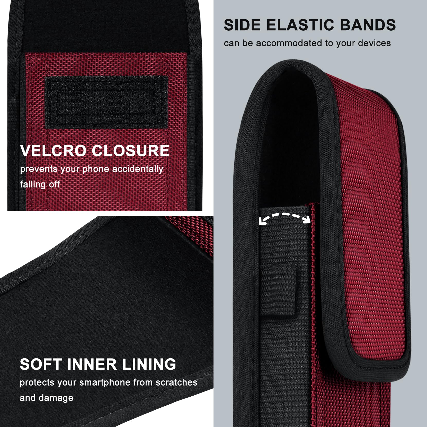Security: Soft inner lining helps protecting your phone from scratches; Velcro closure helps protect your phone from accidentally falling off; Side elastic stretch bands can be accommodated to your devices