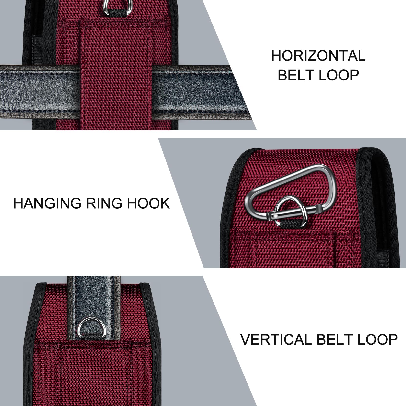 3 Different Ways to Wear: Double stitched belt loops + A metal carabiner hanging ring, this phone belt pouch allows you to choose the way you like to wear it