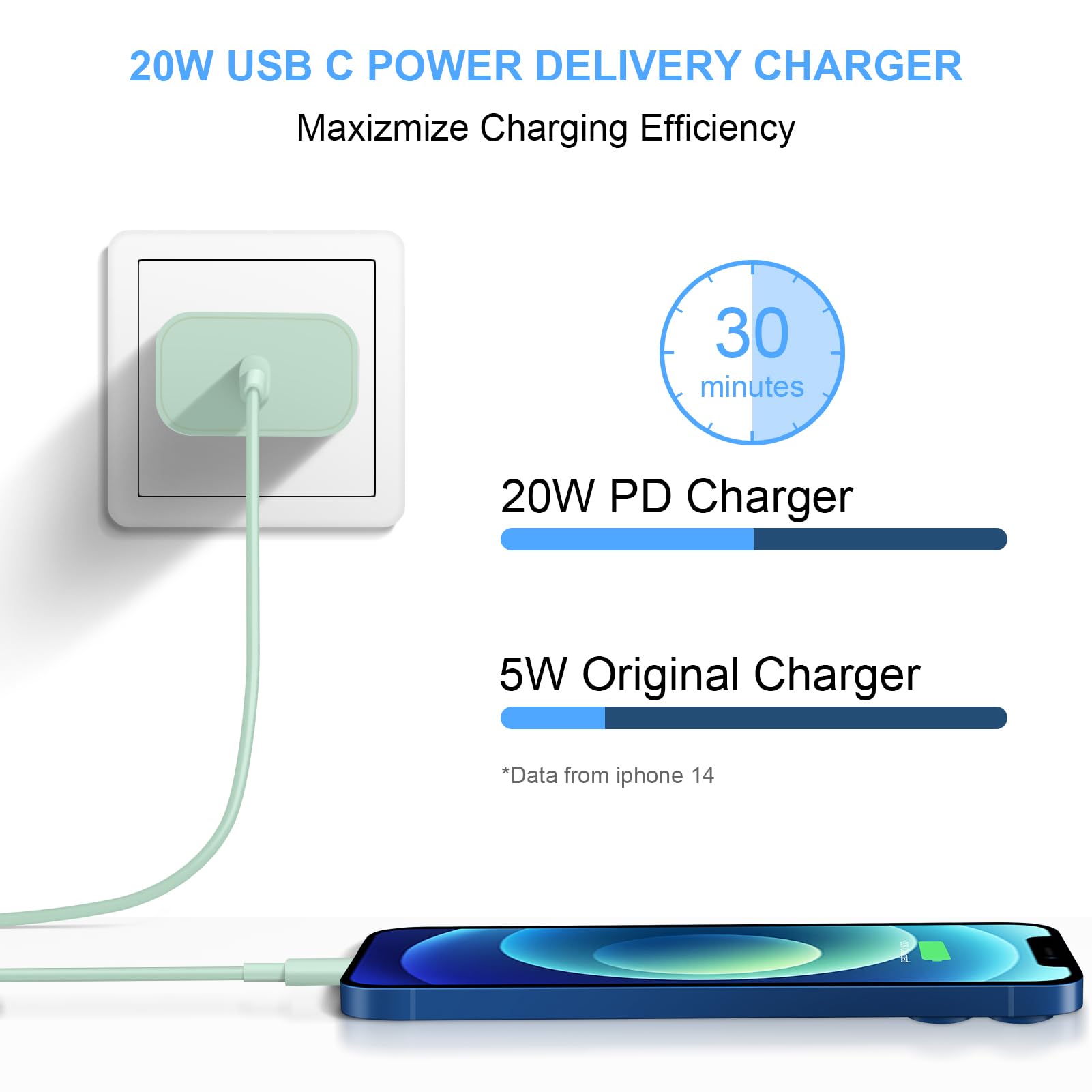 [20W Fast Charger Adapter] iPhone Fast Charger equipped with 20W PD 3.0 USB Type C power delivery wall plug, PD 3.0 Quick-Charge USB C port provides Max 20W output power, charge your device up to 3x faster than original 5W charger,charging your iPhone 17 up to 50% in just 30 minutes, saving over 1.5hrs for you