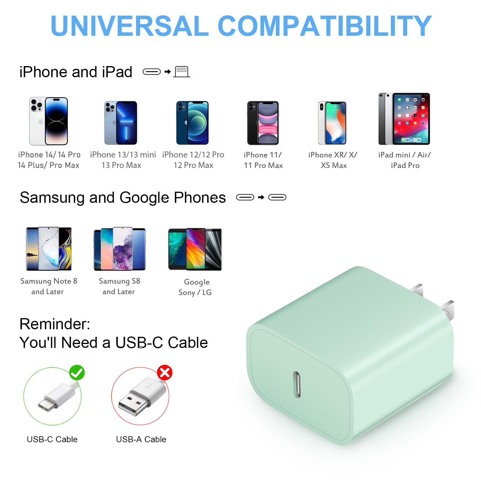 [Wide Compatibility] Fast charge your iPhone 17/17 Air/17 Pro/17 Pro Max, iPhone 16/16 Plus/16 Pro/16 Pro Max, iPhone 15/15 Pro/15 Pro Max/15 Plus/14/14 Pro/14 Pro Max/14 Plus/ 13 / 13 Mini / 13 Pro / 13 Pro Max / 12 / 12 Mini / 12 Pro / 12 Pro Max, iPhone SE, iPhone 11, iPhone XS / XS Max / XR / X, iPad Pro 12.9 / 11 / iPad Air 3 / iPad Mini(2019), Google Pixel 8/7/ 6/ 5/ 4 / 4 XL, Galaxy S22/S21/ S20/ S10 / S10+ / S10e / Note 20 or other devices that support USB Power Delivery