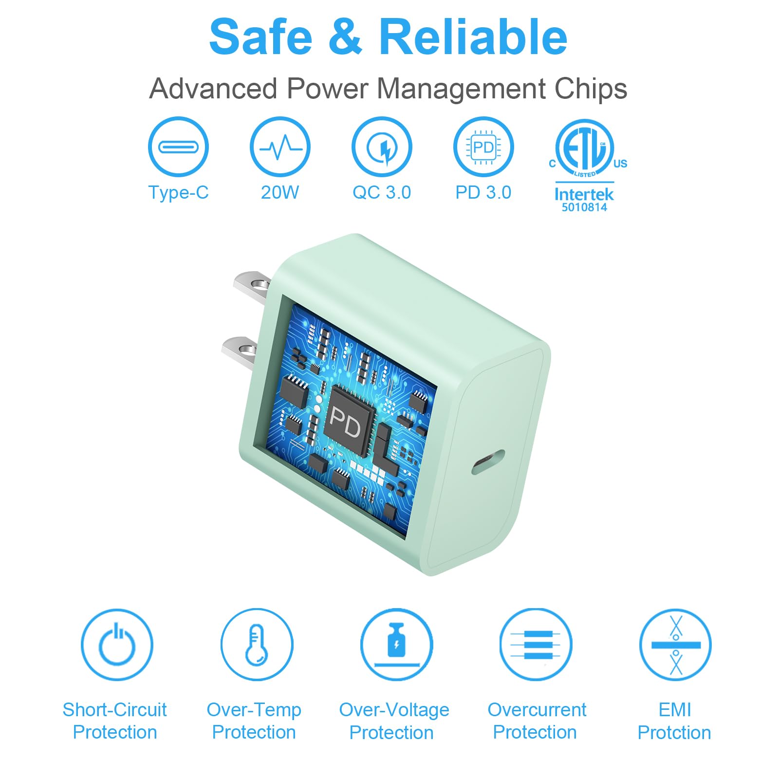 [Safety Protection] Suitable for the U.S. and the World electrical standards, It has ETL(US),FCC,CE,ROHS,certificated, The shell is made of high quality ABS material, heat resistance and low temperature resistance, chemical resistance and excellent electrical properties. The Charger Internal High Quality Chips Protect Your Devices from over Heating, Short-circuiting and over Charging