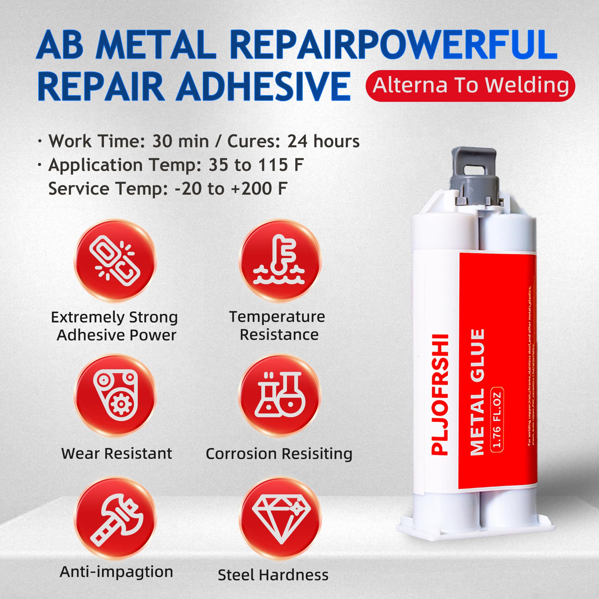 PLJOFRSHI Metal glue is a two-component heavy duty high temperature resistant epoxy resin glue with capacity of 1.76oz for each,including a set of pusher, scraper and mixed ratio 1:1 syringe,can be used for boats, cars, Oil tanks, water pipes, heaters, vases, fences welding car bumpers, motorcycle crack repair,It is a good nontoxic and nonirritating odor cold welding glue.