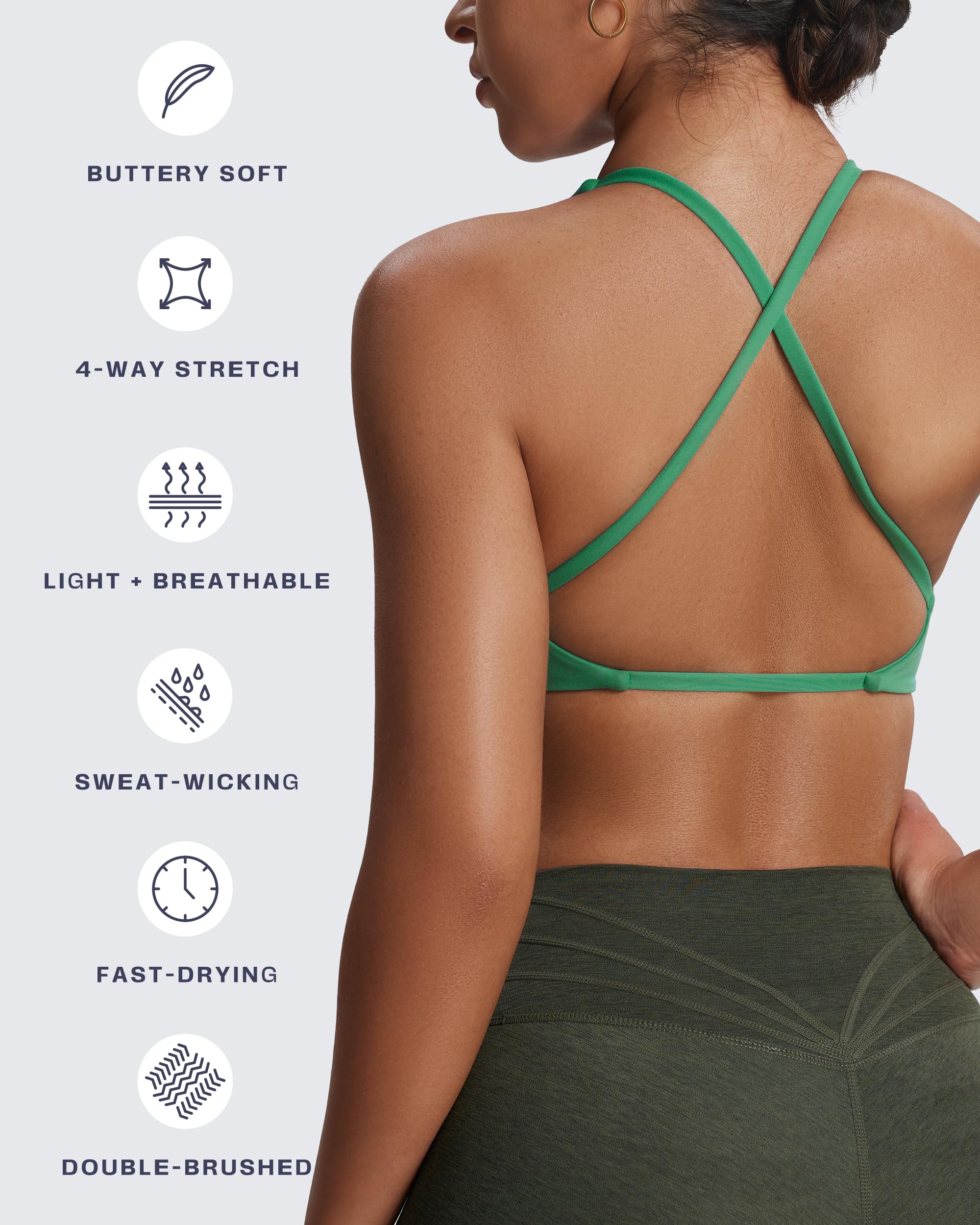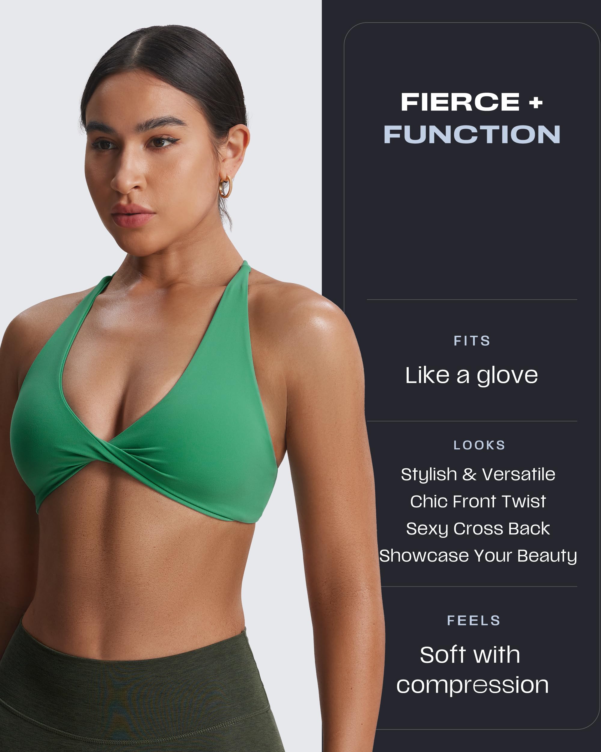 The Sienna twist womens sports bra featuring thin crossed back straps and padding, despite small straps, it doesn’t bite into your traps and cause neck pain