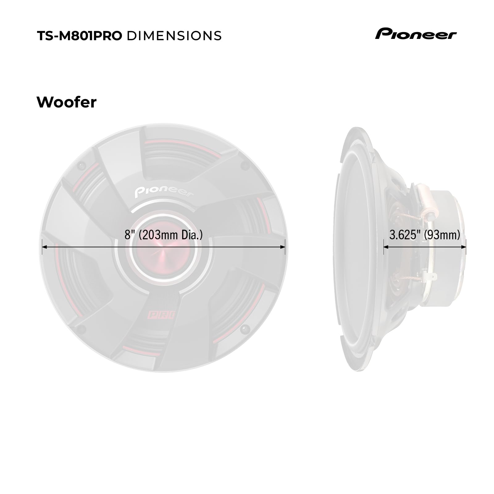 Upgrade your car's audio system with the Pioneer TS-M801PRO Car Speakers. These speakers are designed to deliver enhanced sound quality and performance, allowing you to enjoy your favorite music like never before. The Pioneer Reference for Open Show (P.R.O.) series of speakers is designed specifically for those looking to produce some serious sound pressure levels. Inspired by Pioneer’s history of record-breaking SPL competition, the new P.R.O. series line of speakers is constructed with the street enthusiast in mind. With an emphasis on efficiency and power handling, the P.R.O. series lineup consists of bullet tweeters, mid bass drivers, and a subwoofer that can be mixed and matched to deliver impressive output, without requiring a significant investment. With a maximum power handling of 700 watts and a continuous power handling of 200 watts, the TS-M801PRO can handle higher power levels, allowing you to enjoy louder and more dynamic audio. The speakers are designed to deliver impressive volume levels without sacrificing clarity or causing distortion. Experience improved sound quality, enhanced bass, and clear vocals, bringing your music to life on the road. Enjoy the Pioneer quality and elevate your in-car audio experience.