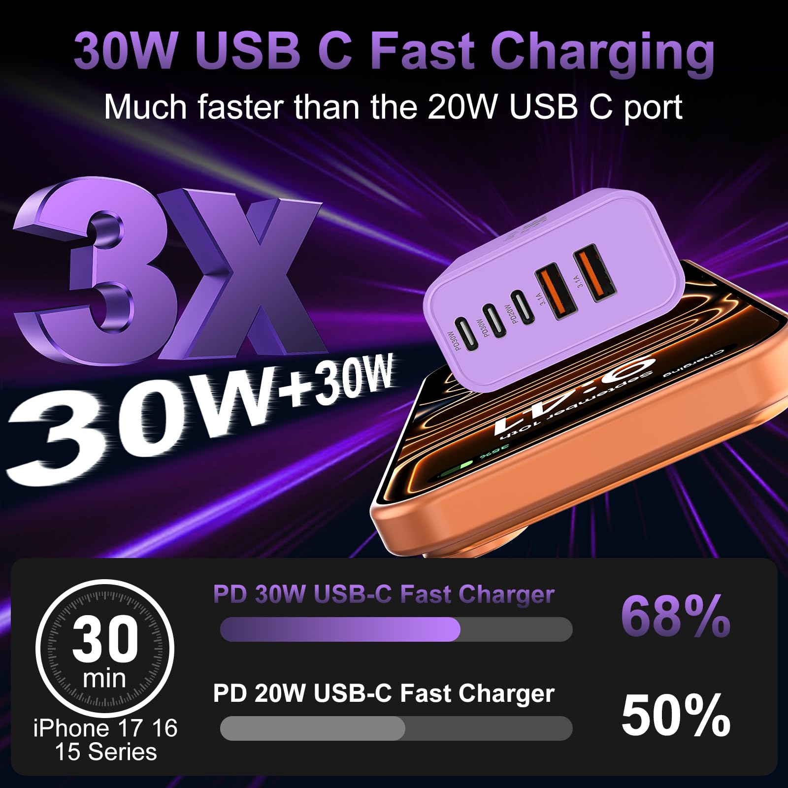 2-Pack 60W USB C Charger Fast Charging Blocks: Auorld 60W USB C Fast Charging Blocks support the Power Delivery and Quick Charge 3.0 fast charging functions with a total power of up to 60W. The USB-A port offers an output power of 3.1 A/5 V, while each USB-C port provides Max 30W output power, charge your Phone 16 15 Pro Max up to 65% in just 30mins, 10% faster than the original 20W USB C charger