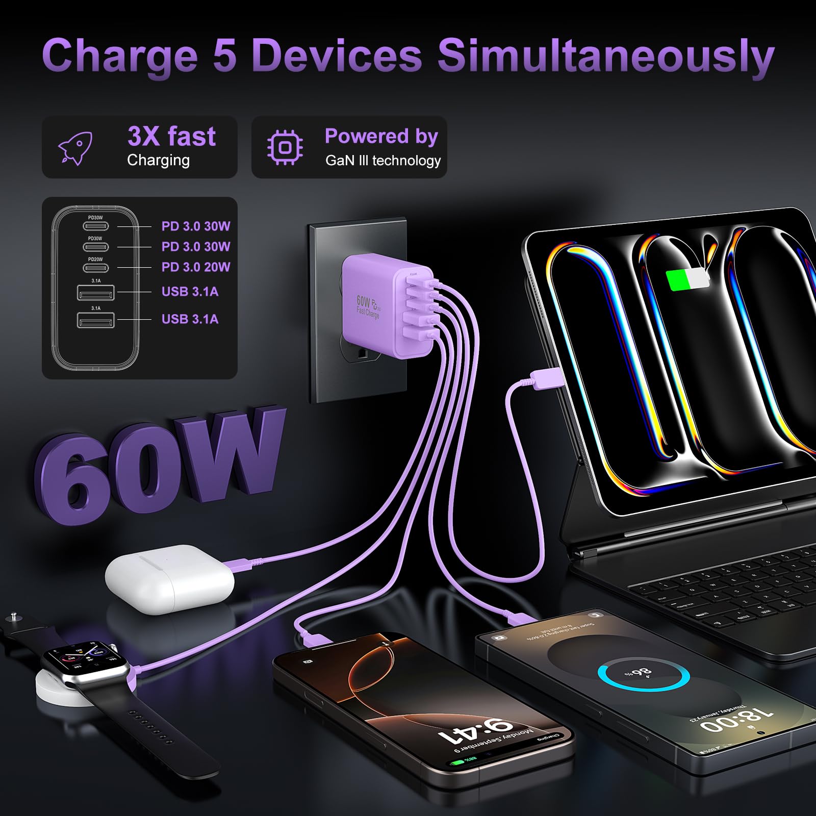 5-IN-1 High Speed Charging Cube for Multi Devices: with 3 USB-C ports and 2 USB-A ports, the newest wall charger brick can fast charge 5 devices simultaneously for efficient power distribution, such as phones, tablets, cameras, power banks, headphones, smartwatches, Swtich etc. One for all, save your outlet space instead of occupying 5 wall sockets. It is the best replacement for your original USB chargers