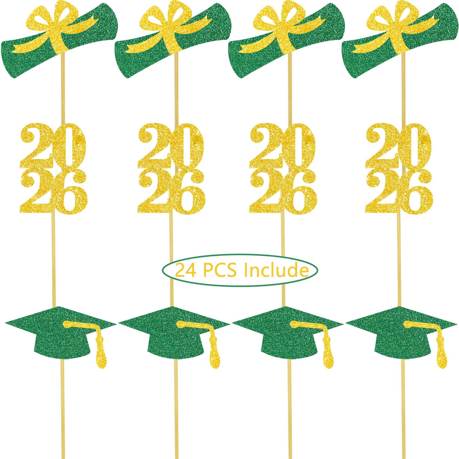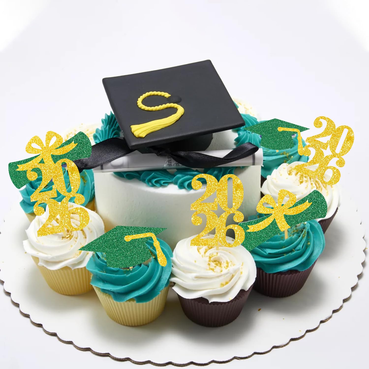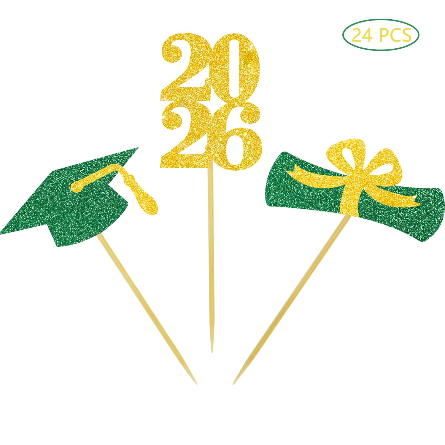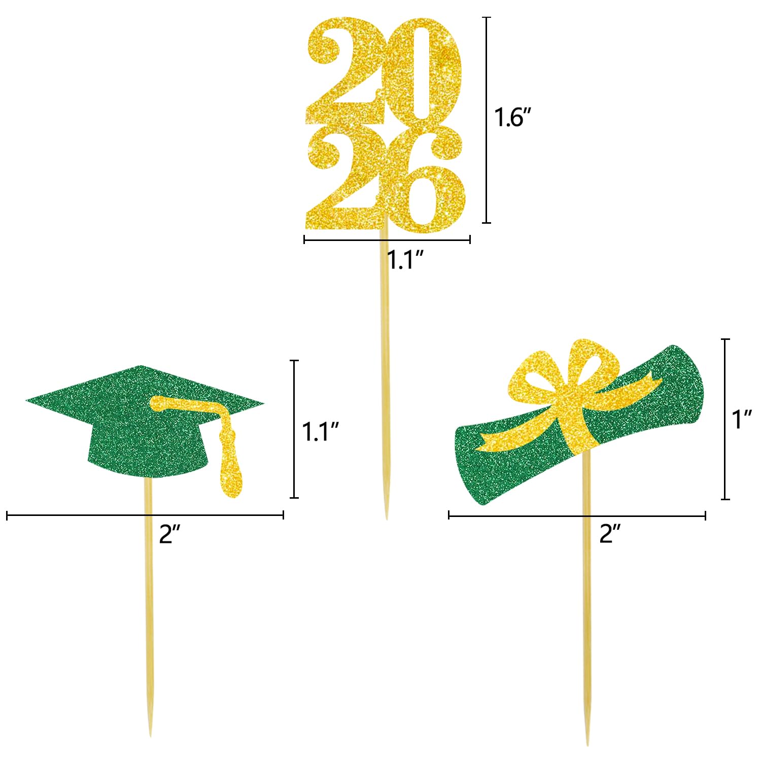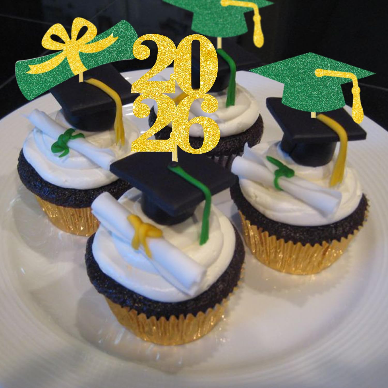 2026 graduation cap cupcake toppers: 8 pcs green grad cap cupcake toppers with gold tassel, 8 pcs gold 2026 number cupcake toppers, 8 pcs green and gold diploma bow cupcake toppers