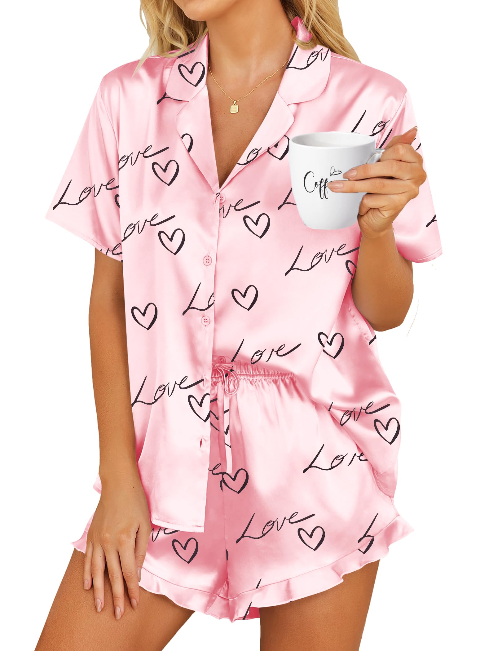 【Unique Fashion Designed】: 2 Piece Satin Pajama Set Featuring Relaxed Style, Short Sleeve, Classic Notch Collar, Full Button Design is easy to put on and take off. Cute Print Pj Set With Elastic Waist Contrast Trim Pajama Shorts will give you more comfortable and freendom feeling when you wear it.