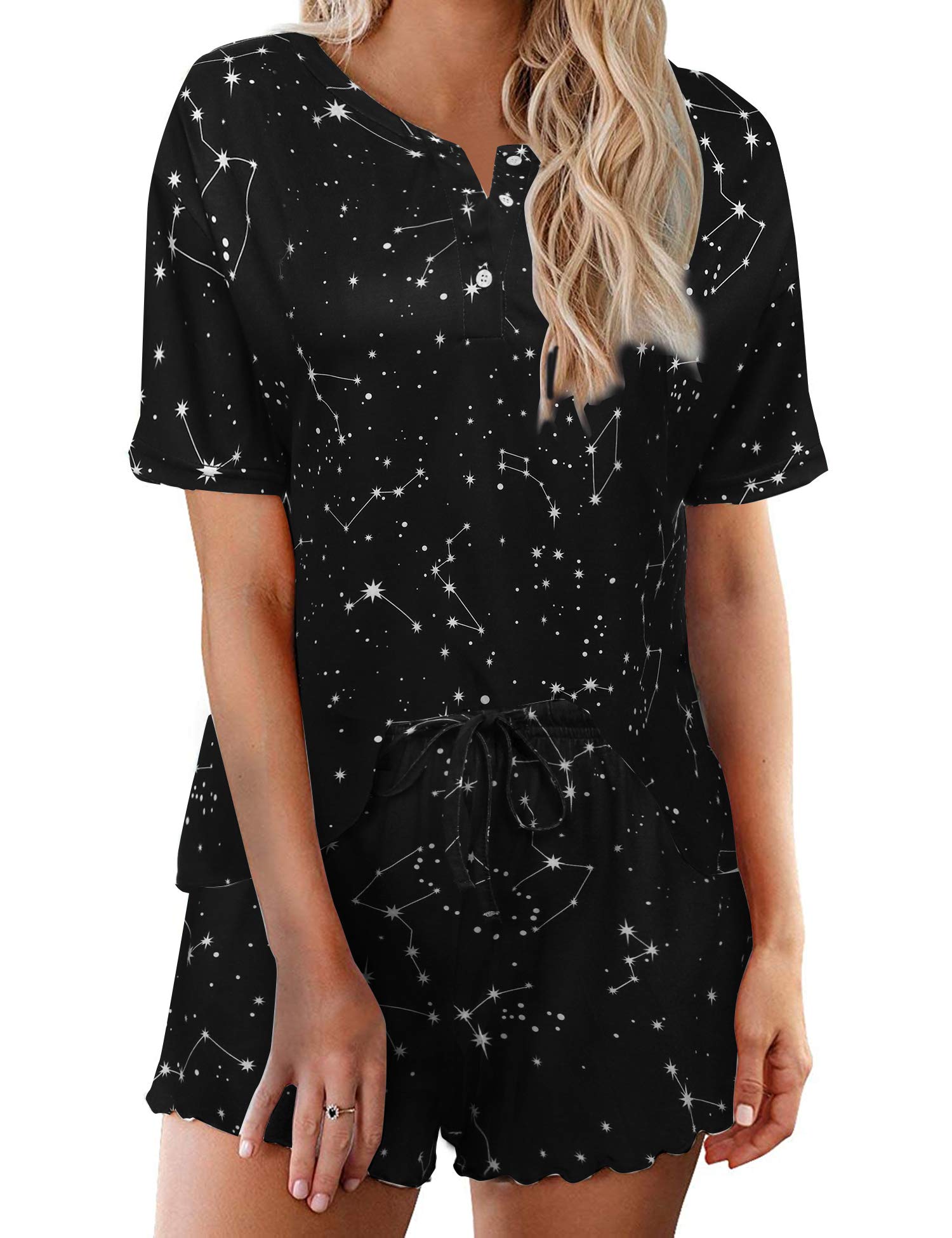 Design: The pajama top features classic chest pocket and V neck, with exquisite hemming workmanship; the pajama shorts features adjustable drawstring and pockets. Loose fit lounge sets, cute and comfy pajamas for women and teens girls