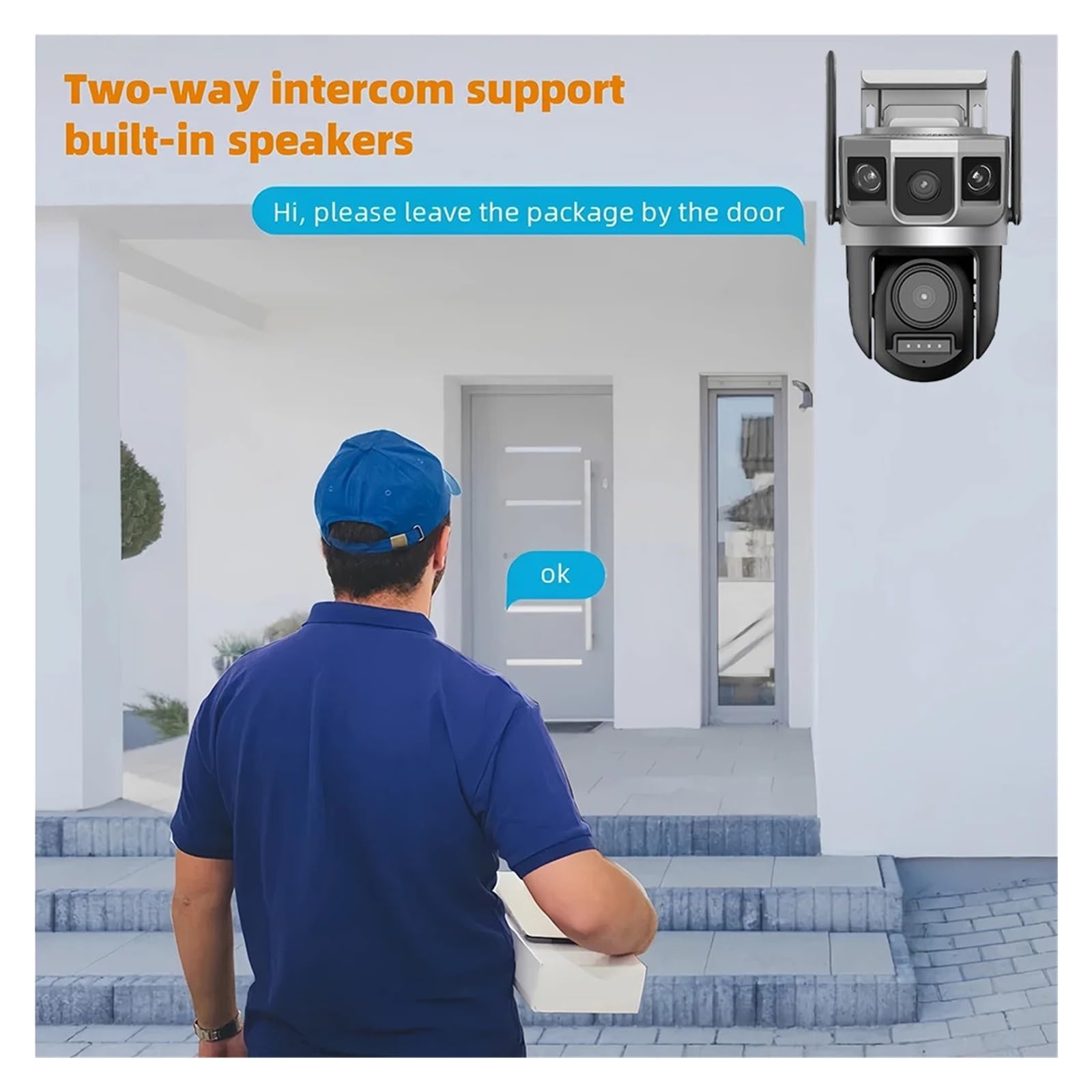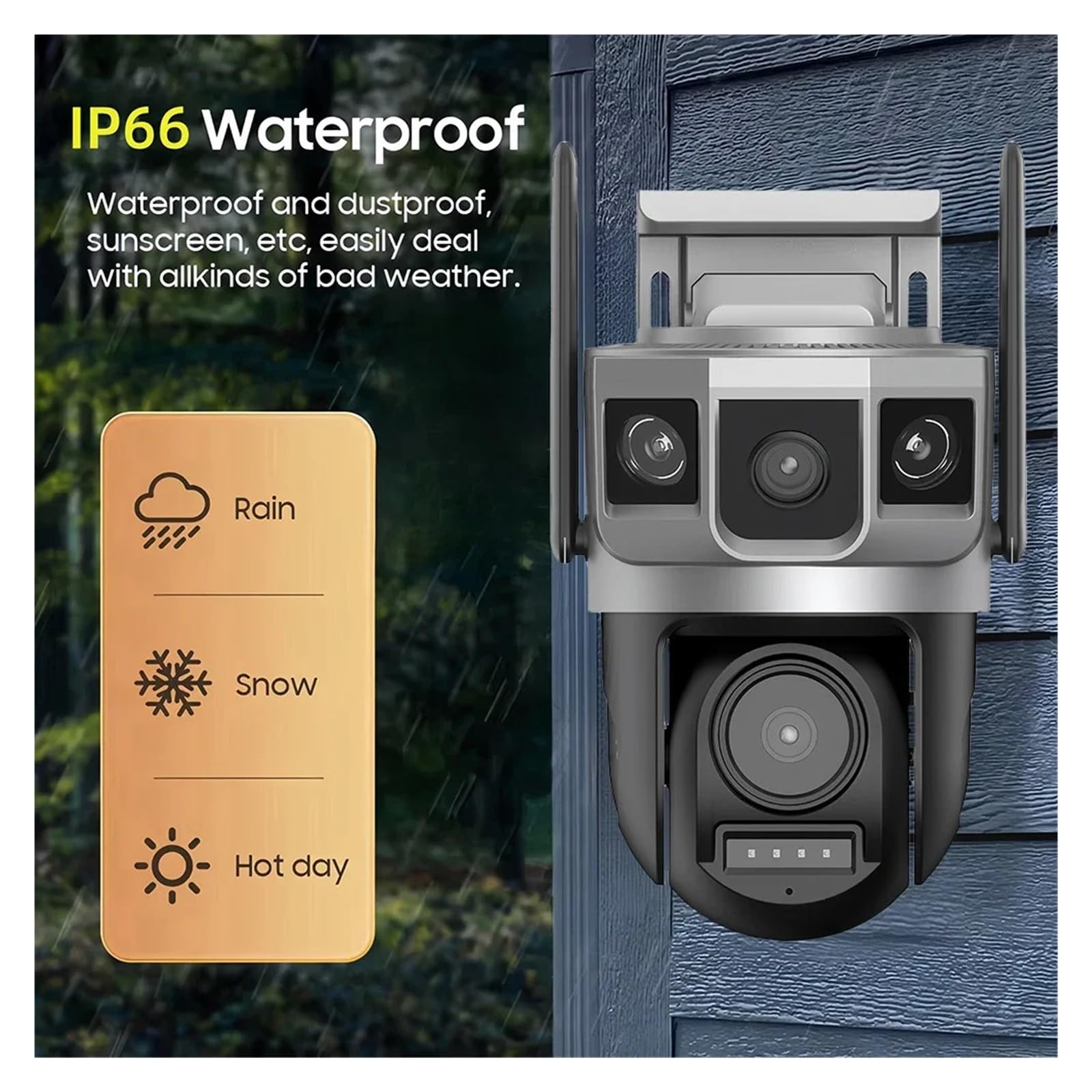 IP66 waterproof + two-way voice, practical all-day: high-quality ABS plastic body, IP66 level waterproof and dustproof, resistant to sun exposure and rain, suitable for indoor and outdoor use; built-in high-power speakers and microphones, clear two-way voice communication, can remotely respond to visitors and warn intruders.