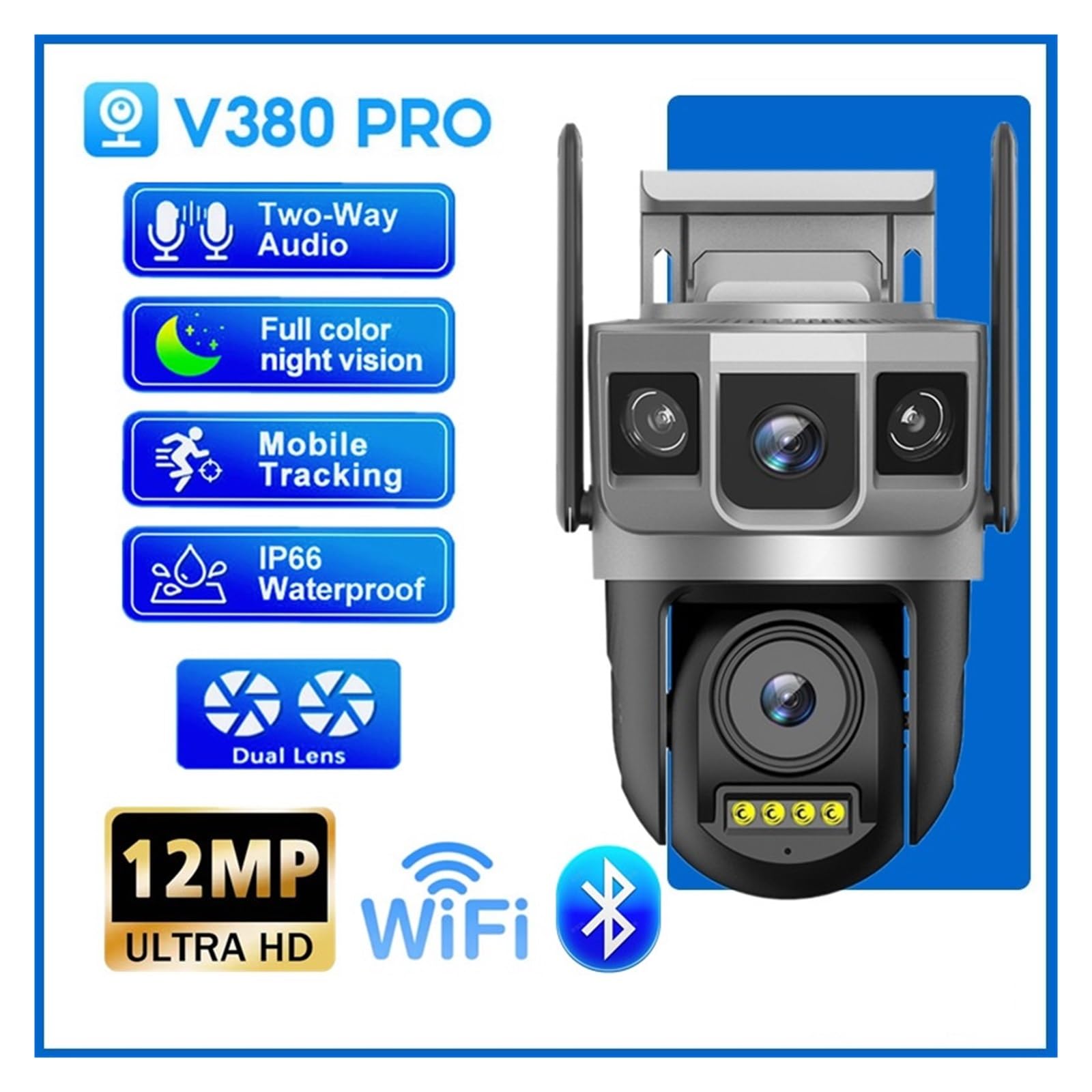 What's in the box? (TF Card not included, optional purchase) 1 x WIFI Camera 1 x User Manual 1 x power adapter 1 x Waterproof Cap 1 x mounting screws bag ========== Zoom type: Digital zoom Zoom: None Lens count: Single lens AI function: Motion detection Color night vision: Yes Operating temperature: -10°C to 60°C IP protection level: IP66 Application name: Other Power mode: Utility power supply Rechargeable battery: None Scenarios: Indoor and outdoor Tilt movement range (angle): Other Horizontal movement range (angle): 0° to 360° Pixels: 12 million pixels TF card: None Power supply: Normal Installation method: Wall-mounted, suspension Color: Black Customization: No Audio output: Two-way audio Minimum illumination (lux): 0.01 lux Field of view: 80° Video compression format: H.264, H.265 Red light line distance (meters): 10 - 15 meters Power supply voltage (volts): 12 volts Power consumption (watts): 2 amps Sensor: CMOS Model: 12 million pixel WIFI camera Lens (mm): 4 mm Connection method: WIFI (2.4GHz) HD: 1.2 million pixels Style: Bullet-shaped camera Special features: Waterproof/dustproof Alarm type: Local alarm Shell material: Plastic Optical zoom: None Application: V380 Pro (search and download in the app store) Resolution: 12 million pixels Network connection: WIFI, AP hotspot, RJ45 network port Alarm: Motion detection and image push, AI human intrusion detection Storage: TF card up to 128G, cloud storage (optional) Night vision: Red light line distance 10 to 15 meters Waterproof: IP66 Usage scenarios: Indoor or outdoor Features: Dual lenses, three screens "Welcome to Security Camera Store" ✅ 10K ultra-high definition / four-lens panoramic / AI tracking camera coverage, from home security to commercial surveillance, professional solutions protect every inch of your safety! Click to explore → Smart Security Cutting-edge Technology, making surveillance not just about "seeing", but also about "anticipating" risks!▷ 10K UHD resolution (2.5 times the clarity of 4K) ▷ Four sensors + four-screen synchronized monitoring technology ▷ WiFi6 + dual network port stable transmission solution ▷ Military-grade IP65 waterproof and dustproof craftsmanship