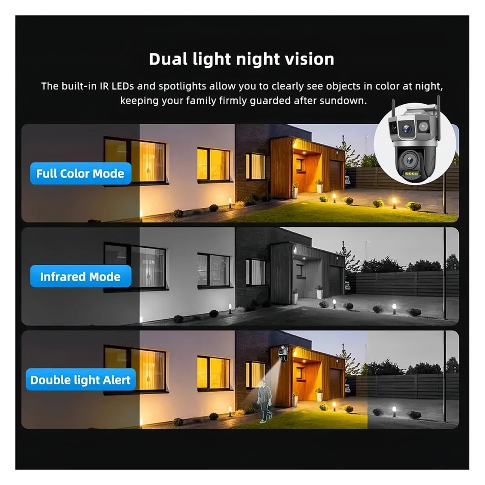 AI intelligent tracking + sound and light alarm, more precise security: AI algorithm realizes 3D positioning and continuous tracking of the target, accurately recognizes human movement, avoiding false alarms; upon triggering, it automatically联动sound and light alarms, sends real-time alerts, remotely grasps the on-site dynamics, and provides more proactive protection.