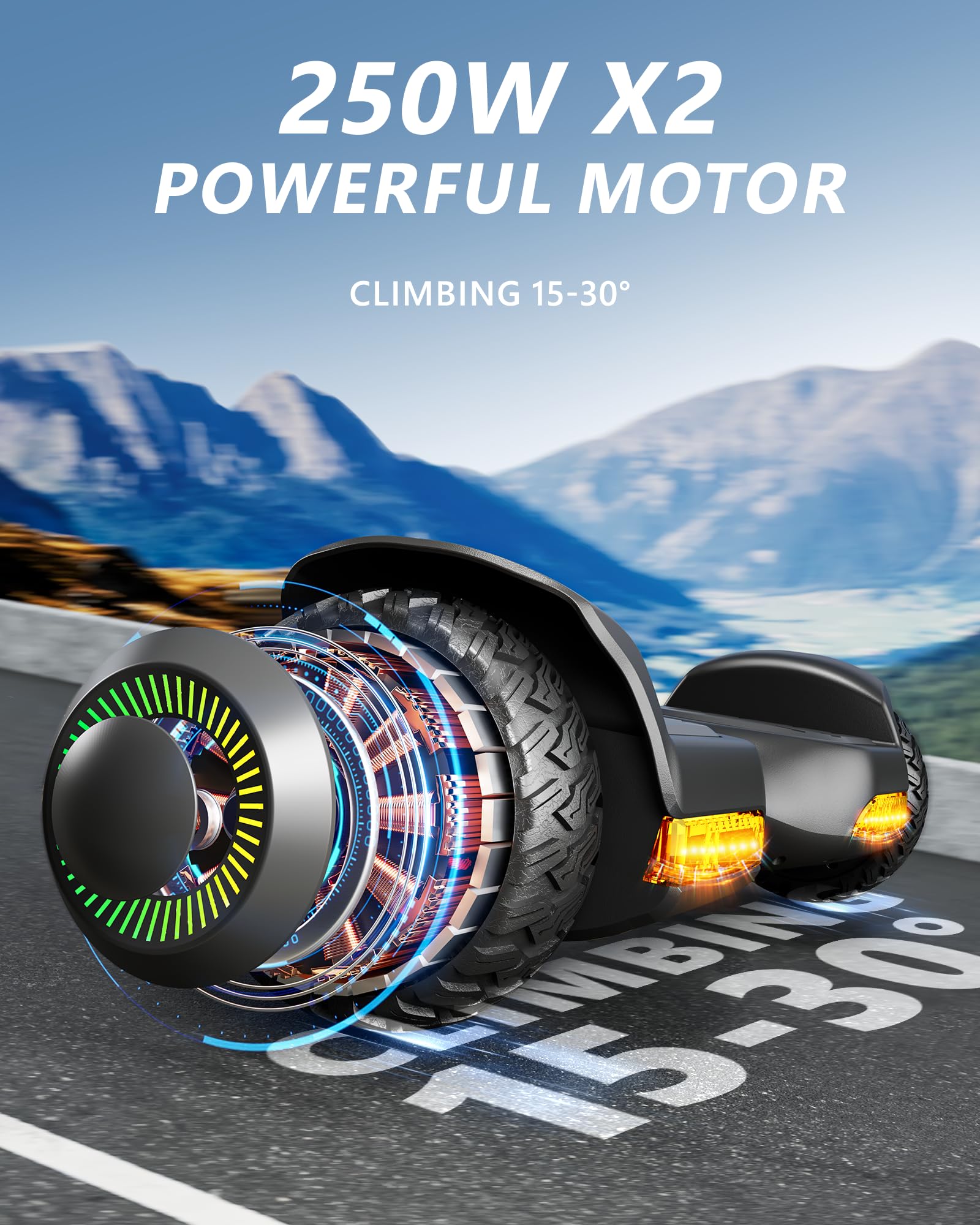 Off Road Self Balancing Scooter - Dual 250W motors offer powerful performance allowing it to climb 15 degrees at a top speed of 7.75 mph. Non-slip rugged 6.5 off-road rubber tires make it easy for riders up to 176 pounds to travel through dirt, turf and even gravel on a variety of surfaces.