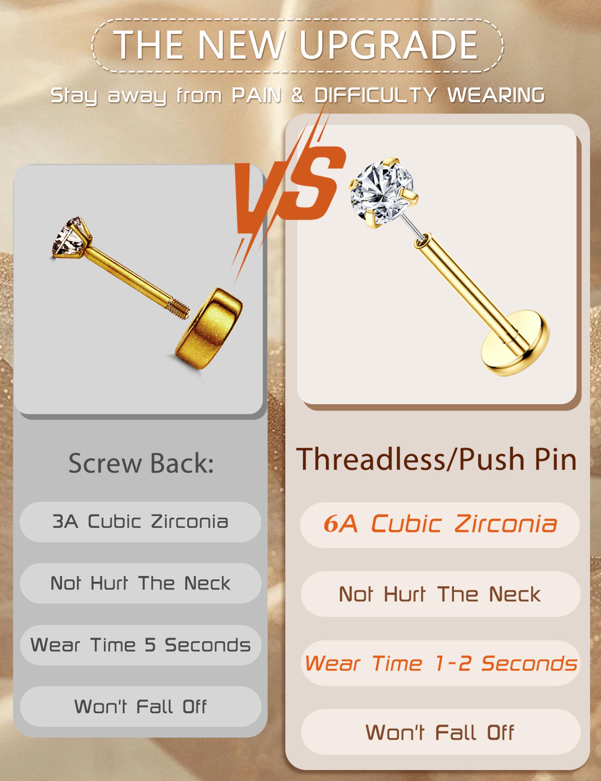 Easy to Wear --Threadless Push in design,compared to traditional threaded Flat Back styles, you only need to move your fingers to put the ear piercing jewelry on and take off in one second. No more screw anything behind your ears,and you donβt have to worry about the threads scratching your sensitive skin.These nap flatback earrings offer convenience and comfort, ensuring a comfortable experience even during sleep, sports activities, daily activities,or showers