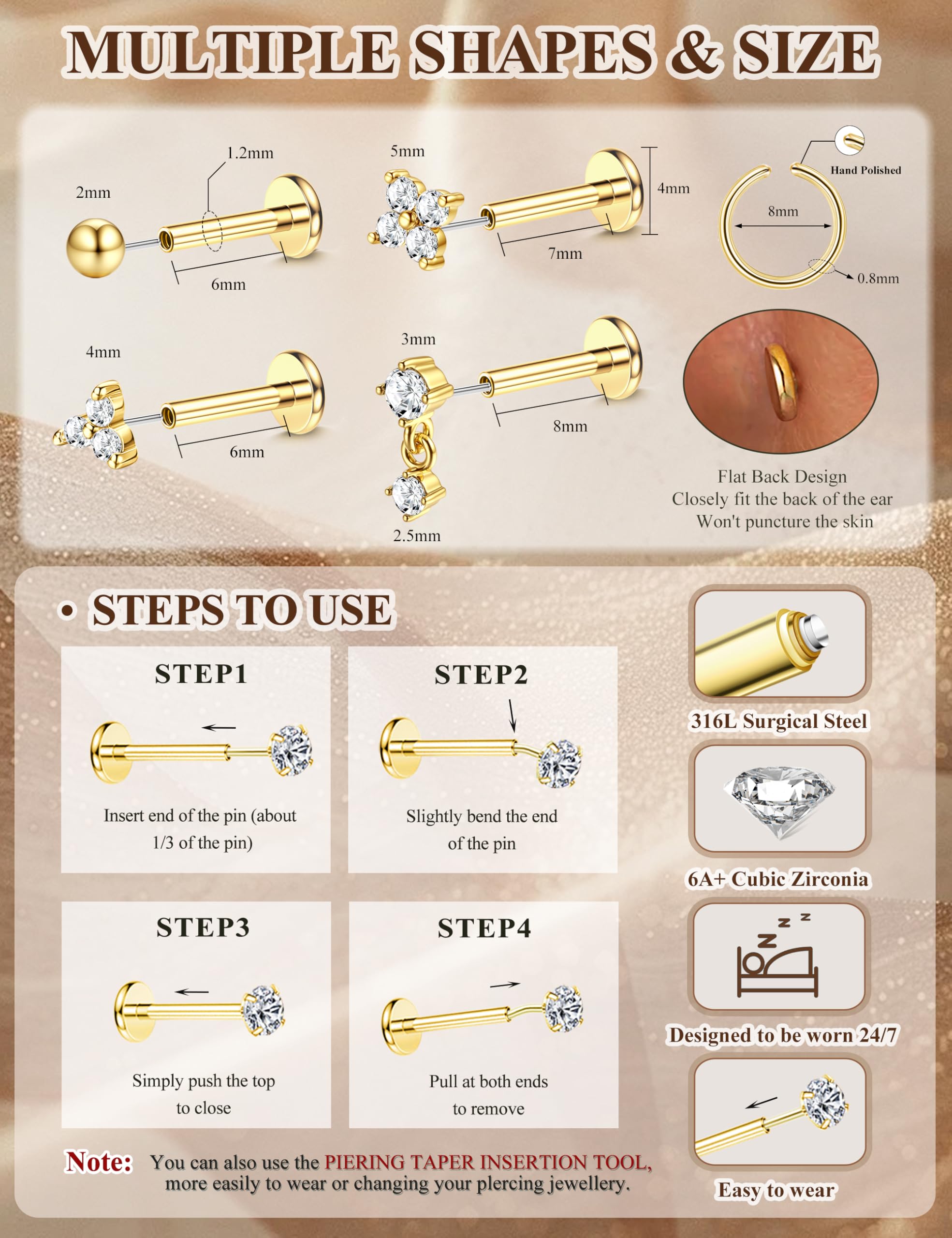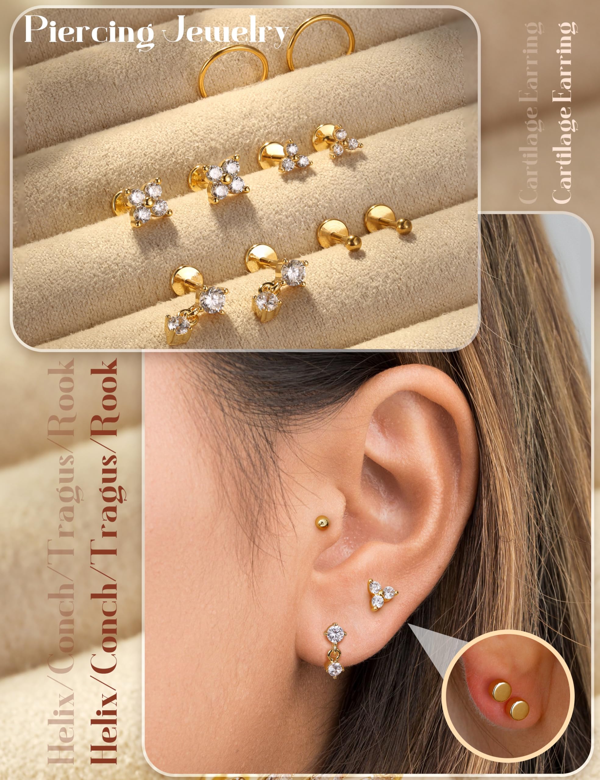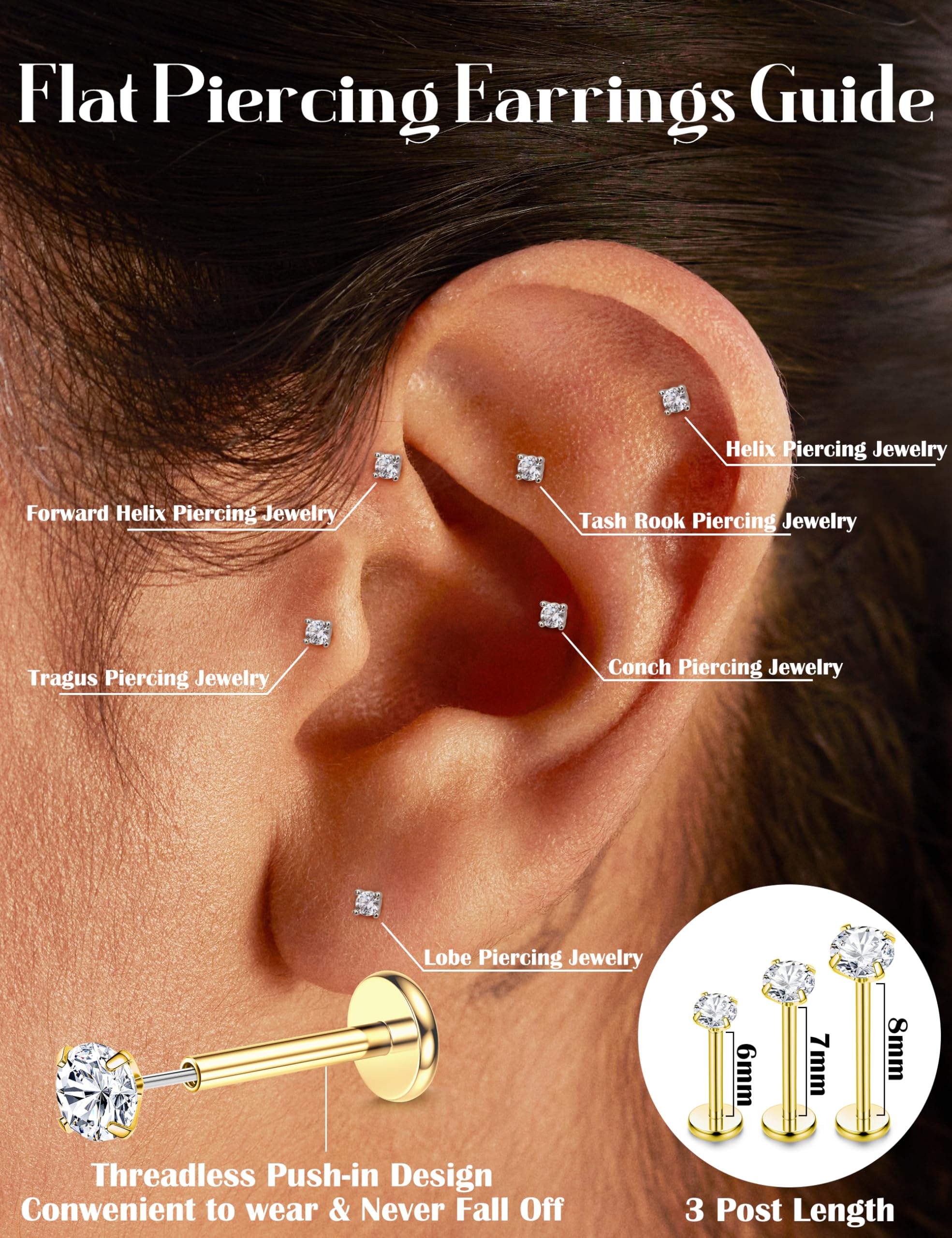 Threadless Flat Back Earrings SetοΌ1 order you will get 4 pairs push in flat back earrings studs ,2pcs 8mm hoops and 1pcs of straight piercing taper.Piercing Stud Gauge Size: 16G(1.2mm)/18G(1.0mm)/20G(0.8mm) Bar Length: 6mm/7mm/8mm,meet your different needs.Color: silver/18K gold Plated .AAAAAA+ cubic zirconia,which is staying securely set, Long-lasting shine.Dainty tiny stud earrings are suitable for most women and men.EACH POST FITS ALL THESE THREAD TOP