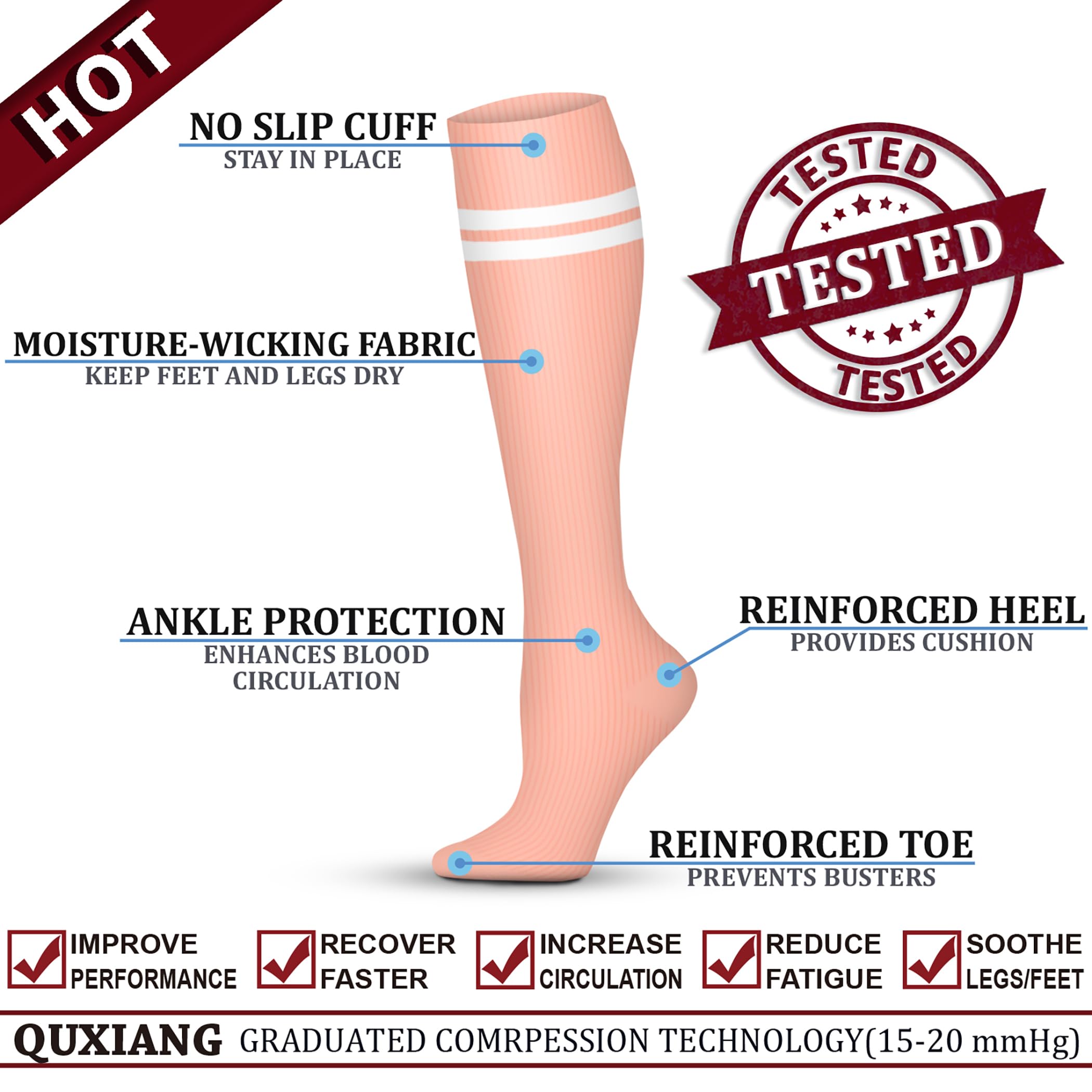 COMPRESSION BENEFITS - QUXIANG Compression socks are designed to promote blood circulation and oxygen flow preventing fatigue and helps in muscle recovery. Whether you are an athlete, sportsperson, teacher, flight crew, receptionist, office worker, pregnant, recovering patient, nurturing mother, elderly, our socks are universally suitable for all work.