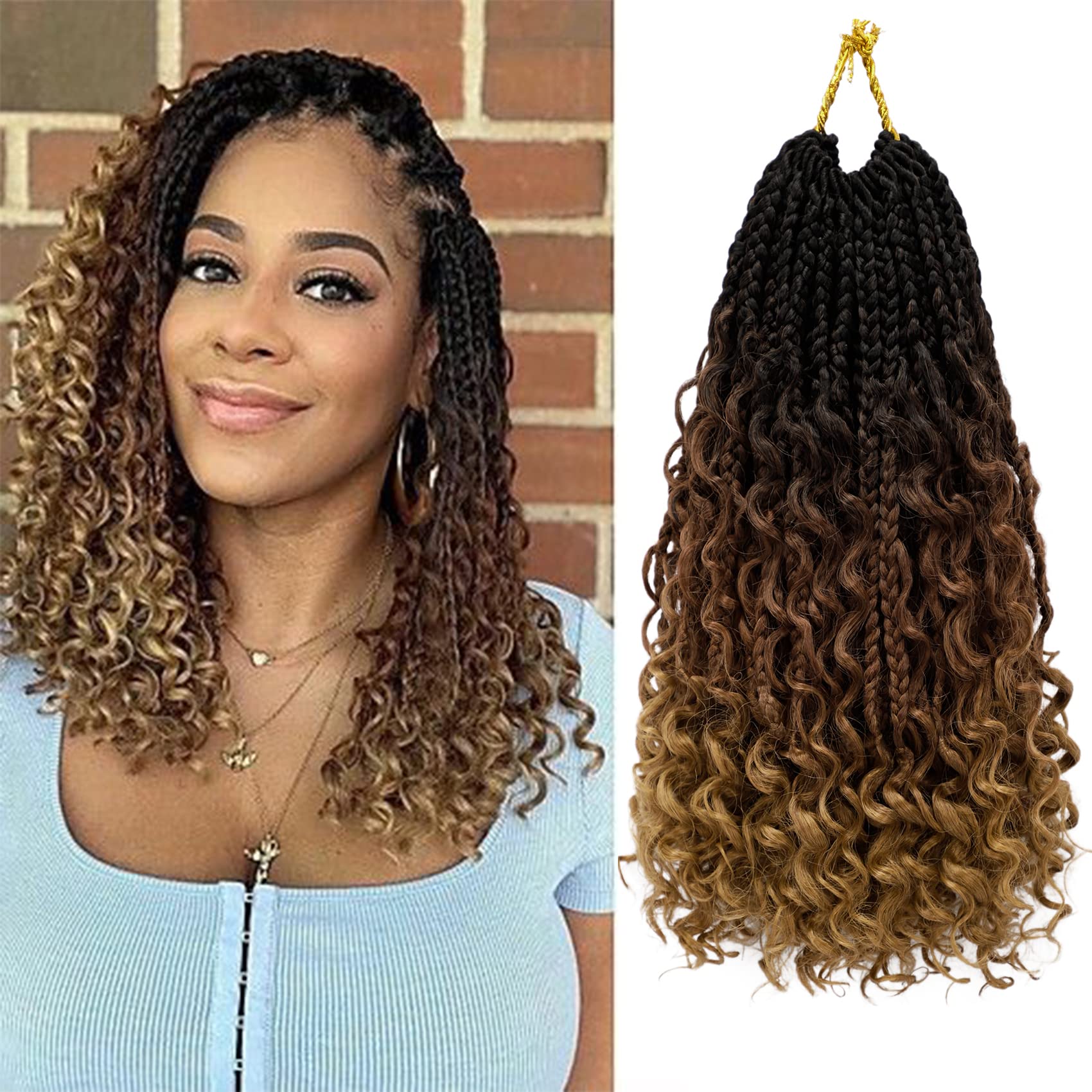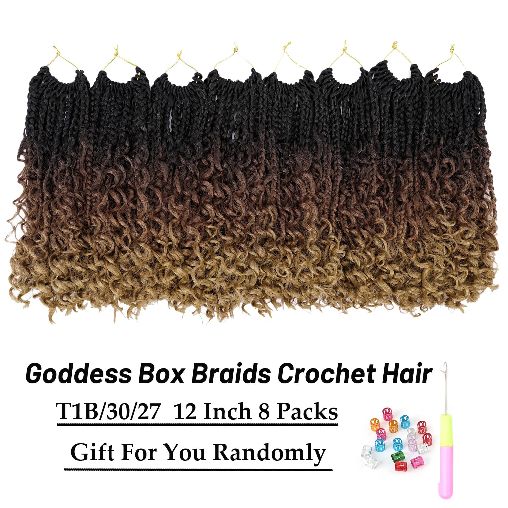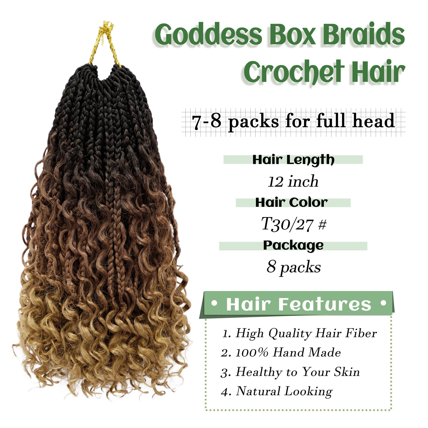 Hair Length and Package: goddess box braids crochet hair is 10 inch, 12 inch and 14 inch, 16 strands one pack, 8-9 packs are enough to make a full head. Hair Color:1B, #2 , #27 , #30 , 1B /27 color, 1B/30, T30/27,T30/613,Tgray color and 1B/Burgundy color. More colors are available.