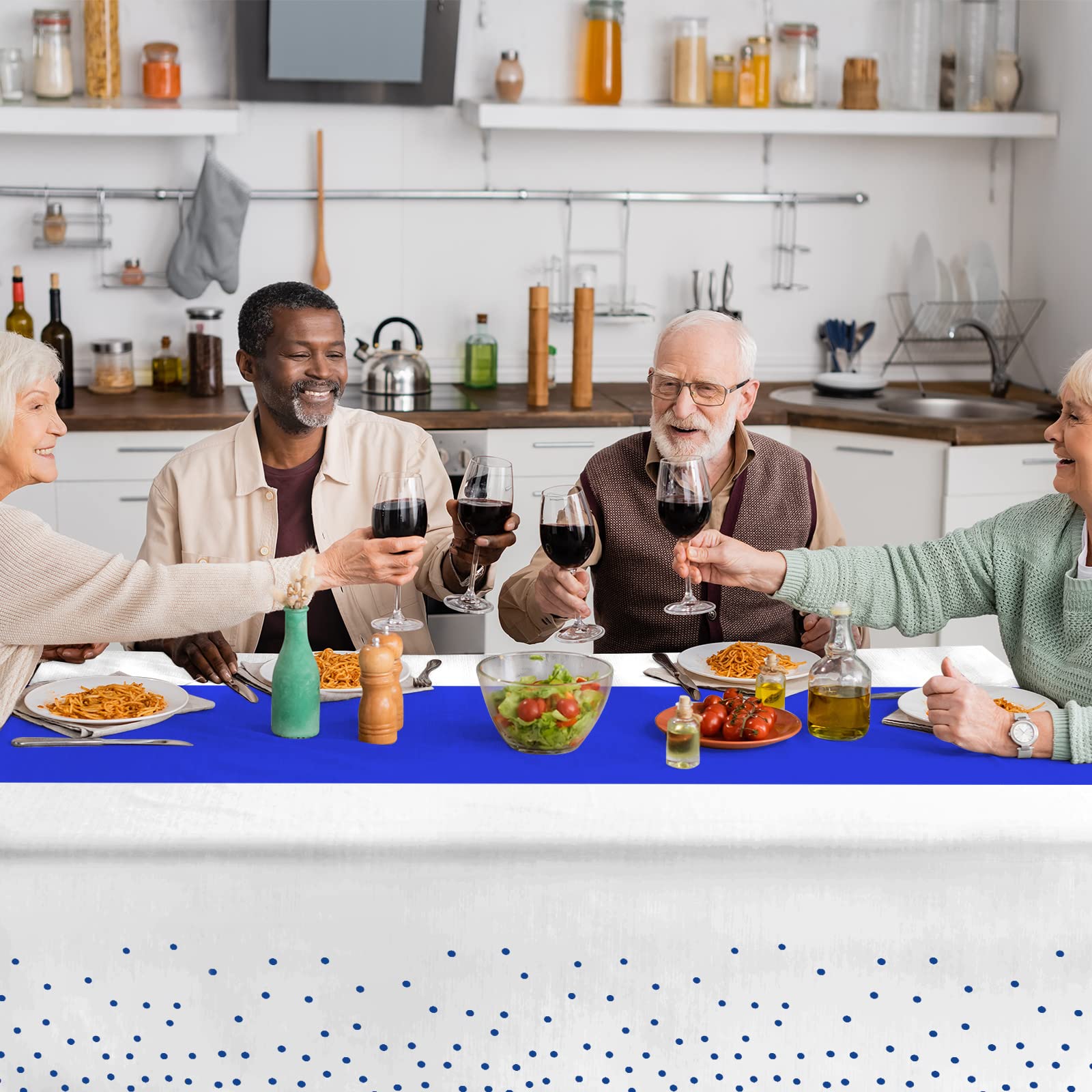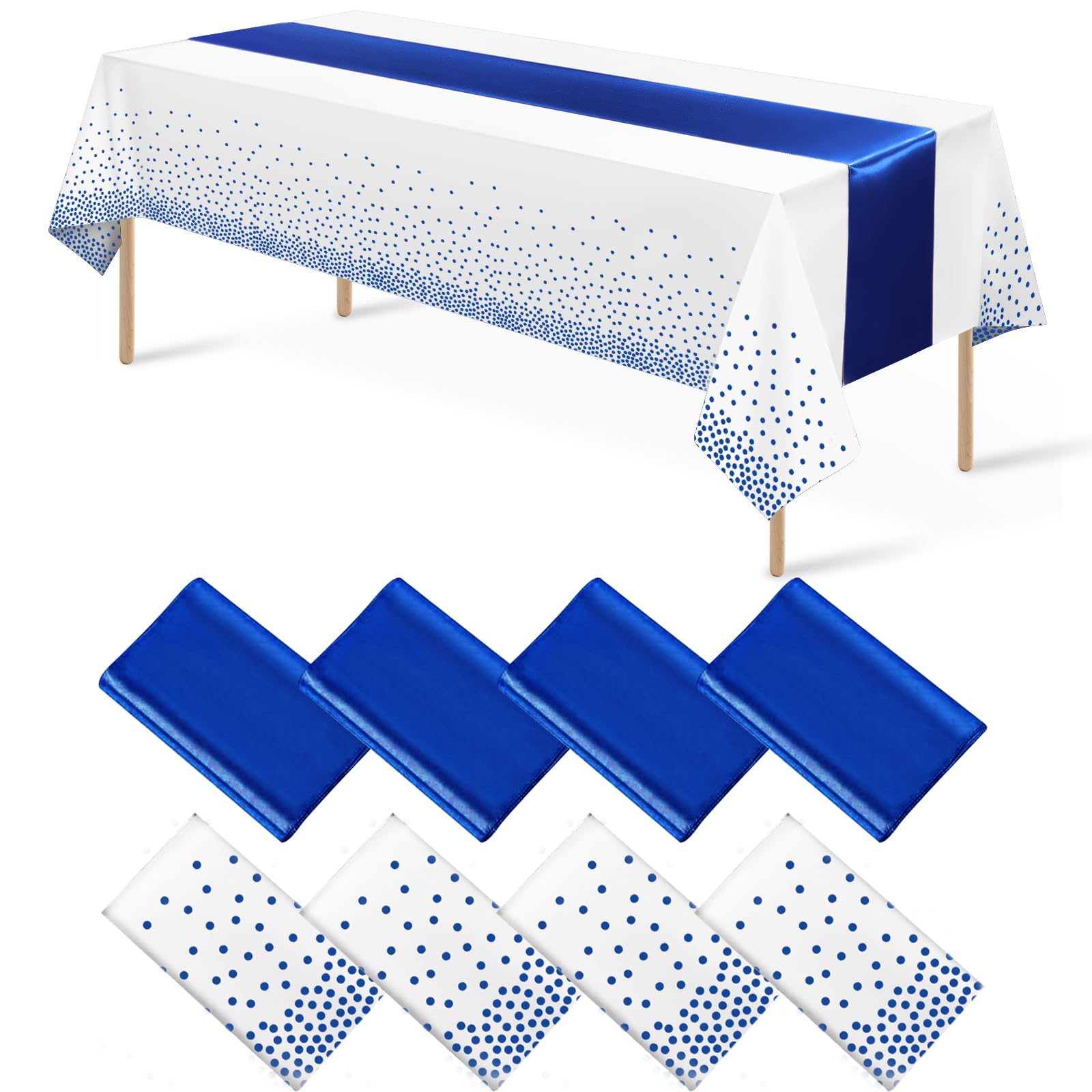 What you will get: the package includes 4 pcs white and royal blue confetti dot plastic tablecloth and 4 pcs blue satin table runner, specific color as the picture shown, nice combination for you to use in daily life or important occasions enhancing the atmosphere for your event.
