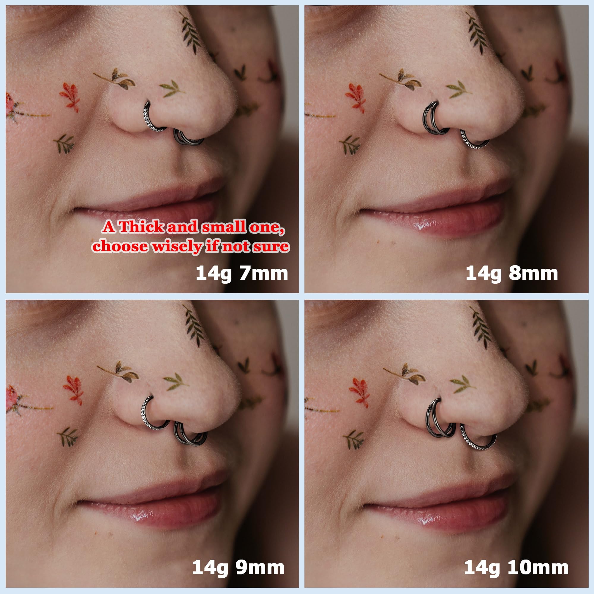 Seamless Black Plated Nose Ring Hoop: Gauge size: 14G(1.6mm); Inner diameter: 7mm(0.28 inches); Material: 316L stainless steel; One order includes 3 piece of hinged segment ring, comes in various styles to meet your fashion needs: sparkly CZ nose hoop, double hoop nose ring, dainty single septum hoop;We've provided the size comparison chart for you reference
