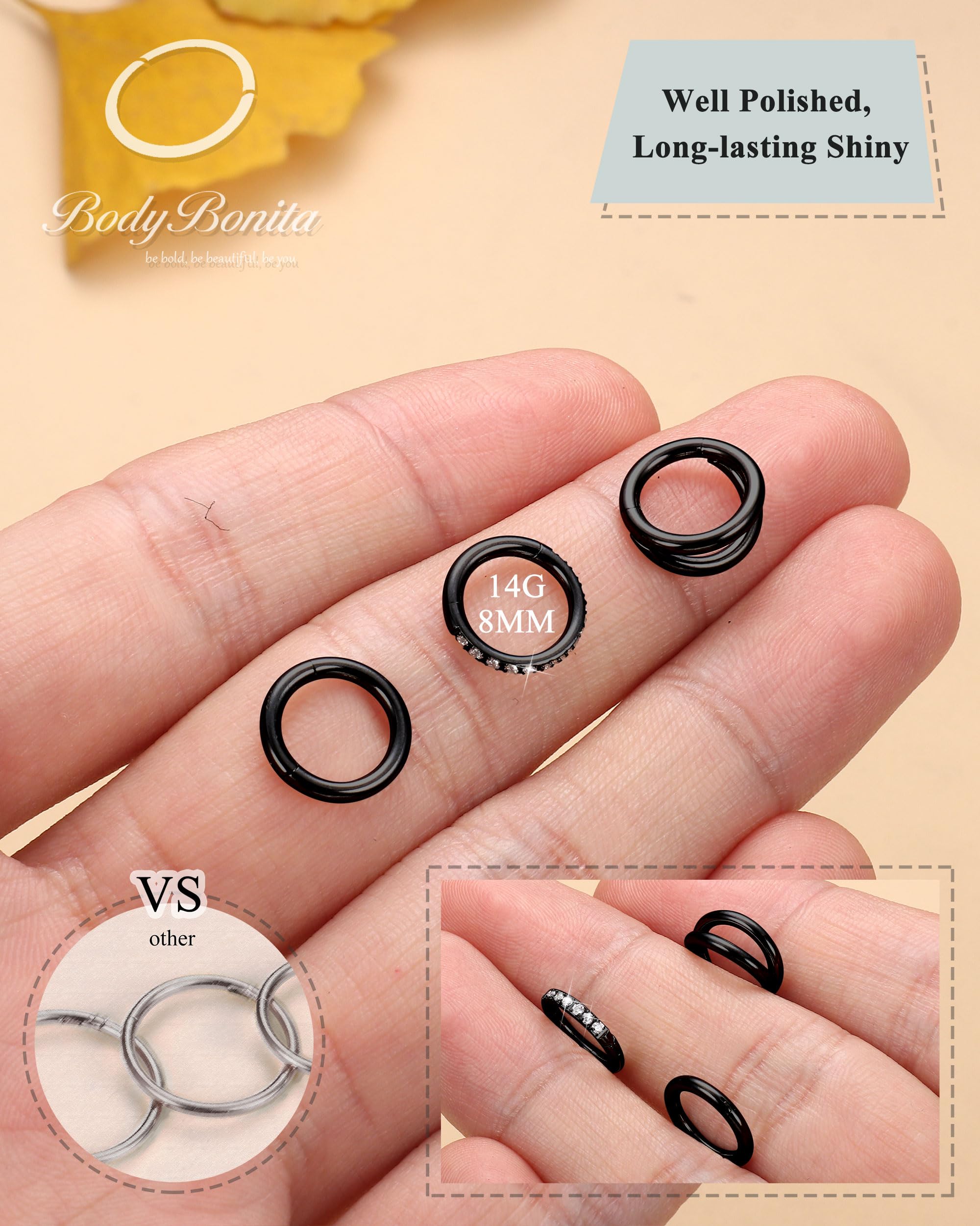 Description What you get: 3 pcs of BodyBonita seamless nose ring(14K gold plated/silver/black plated/rose gold plated ), crafted to be brilliantly shiny, hypoallergenic, and effortlessly easy to put in and take out. Materials: 316L stainless steel. Style in One Package: cubic zirconia nose hoop, double nose ring hoop, classic single nose rings hoop. Available Color: 14K gold plated/silver/black plated/rose gold plated. Avaliable Gauges Size: 14g, 16g, 18g, 20g. Avaliable Inner Diameter : 7mm, 8mm, 9mm, 10mm. Product Types: Lip piercing/aretes para labios, Septum ring, Hoop belly button rings, Cartilage earring, Daith piercing jewelry, Conch hoop earring, Helix earring, Tragus earring, Rook earrings, Acero inocidable dorado arete percing, Nipple rings.