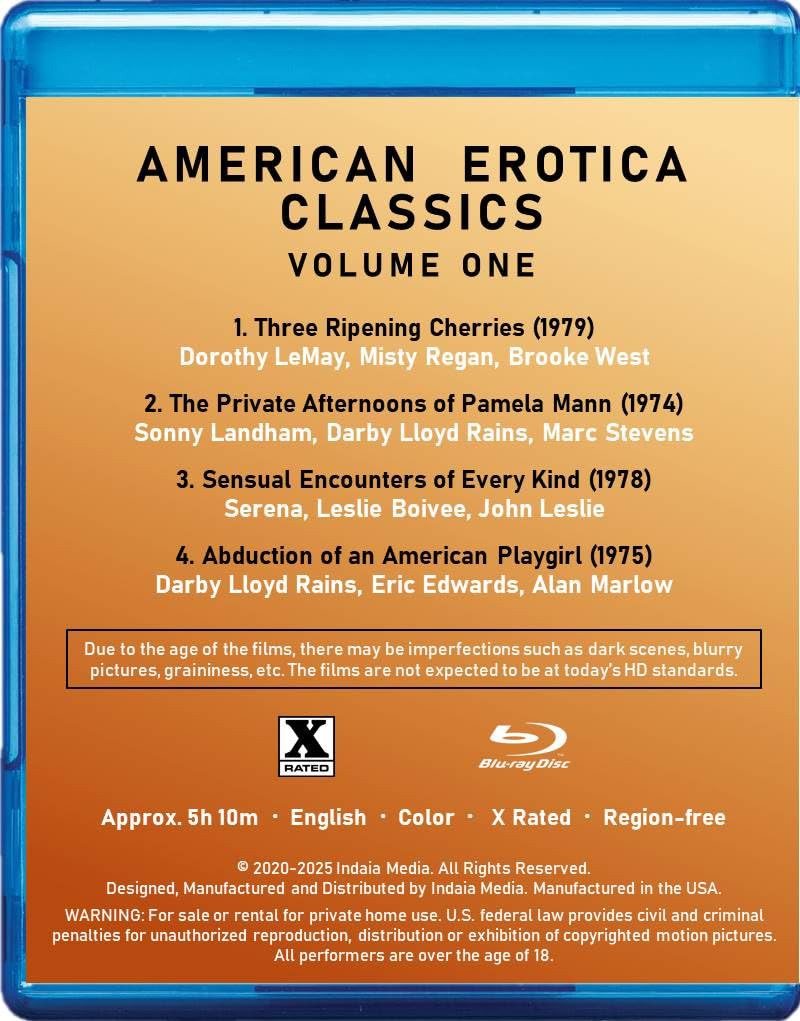 Film titles: 1. Three Ripening Cherries (1979) 2. The Private Afternoons of Pamela Mann (1974) 3. Sensual Encounters of Every Kind (1978) 4. Abduction of an American Playgirl (1975) -- X-rated -- Approx 5 hrs 10 mins -- 1 blu-ray disc -- Region-free -- 7 mm blu-ray slim case 2020-2025 Copyright Indaia Media. All rights reserved.