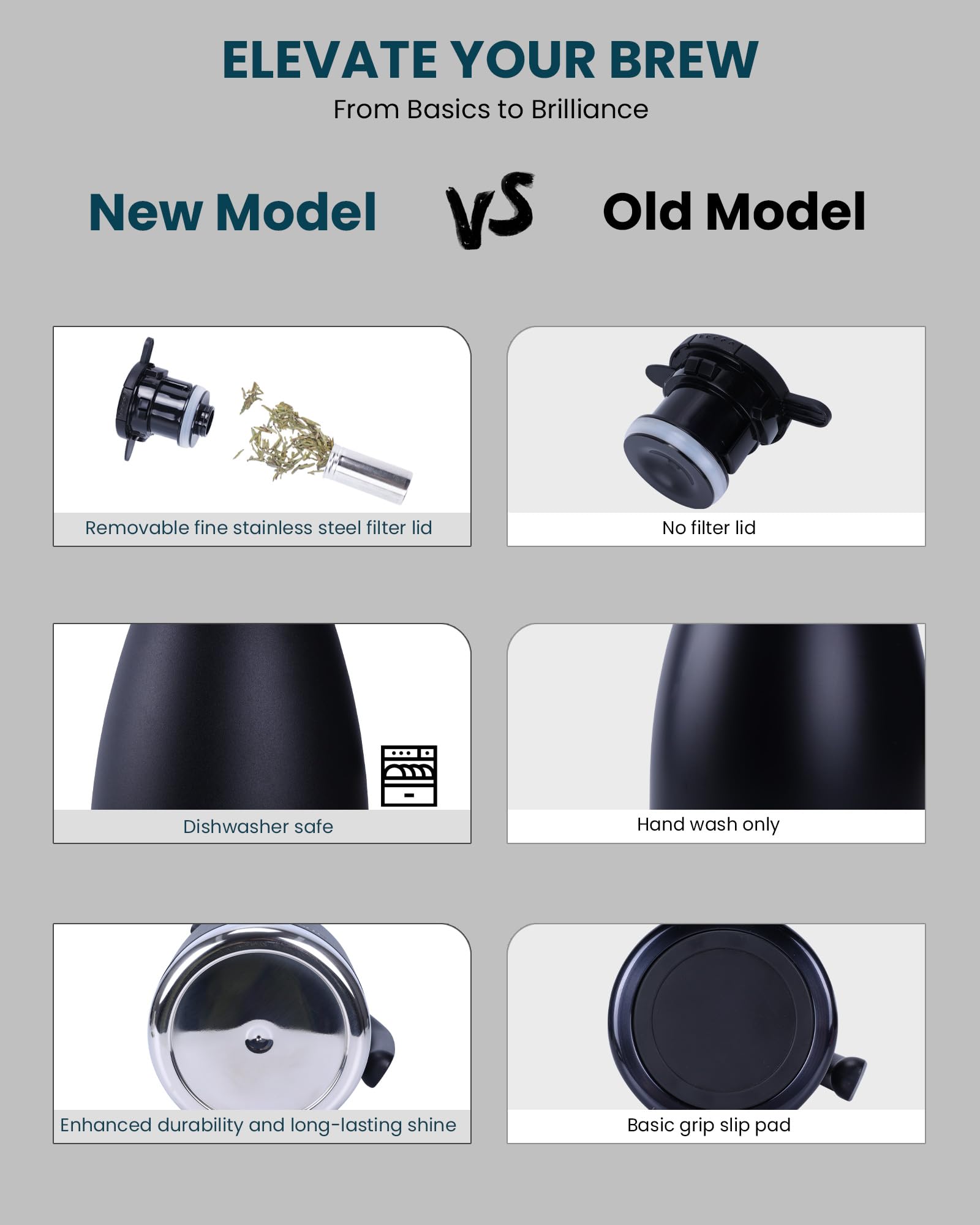 🍵 Removable Infuser for Fresh Loose-Leaf Tea – Includes a removable/detachable filter that lets you steep tea directly inside; easily taken out for rinsing, more hygienic than fixed mesh. Dishwasher-safe parts make cleanup quick and convenient. Perfect as a tea infuser carafe or insulated teapot for residue-free flavor.