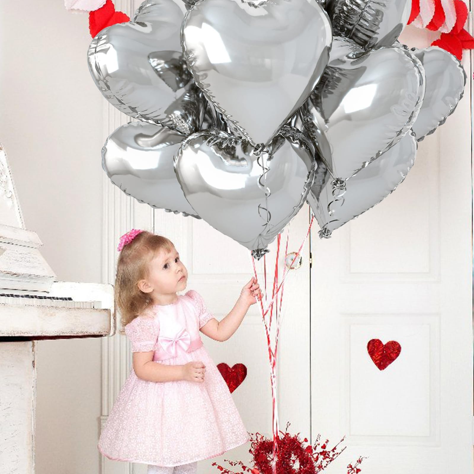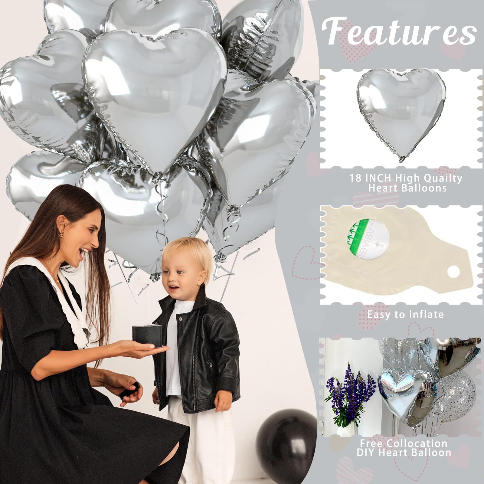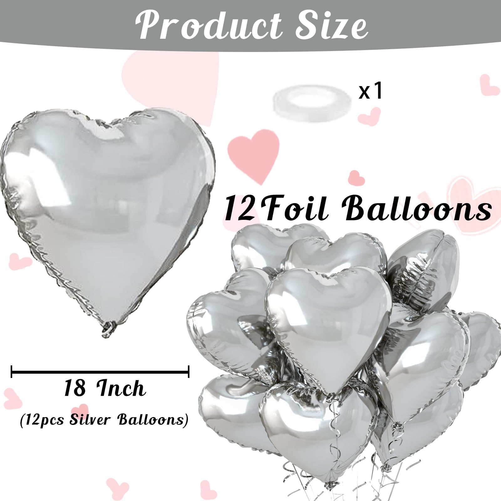 12 Silver Heart Balloons: The package includes 12 x 18 inch silver heart balloons with 1 ribbon. Silver foil heart-shaped balloons add a touch of fun and surprise to any party or holiday celebration. Their size is 18 inches, which is the perfect complement to your decoration needs, leaving unforgettable memories for your guests!