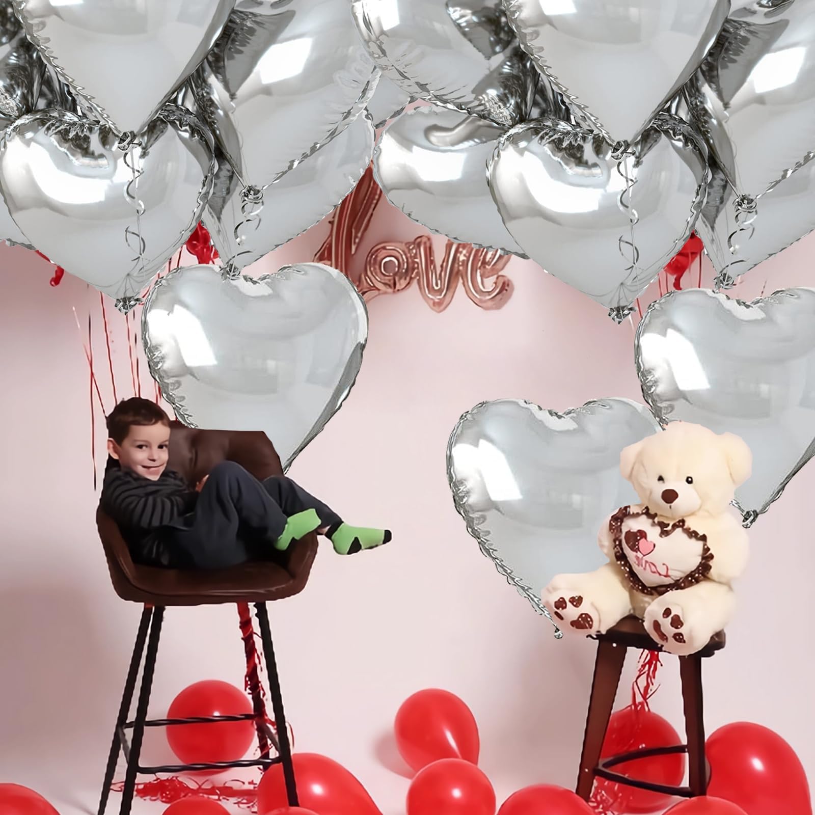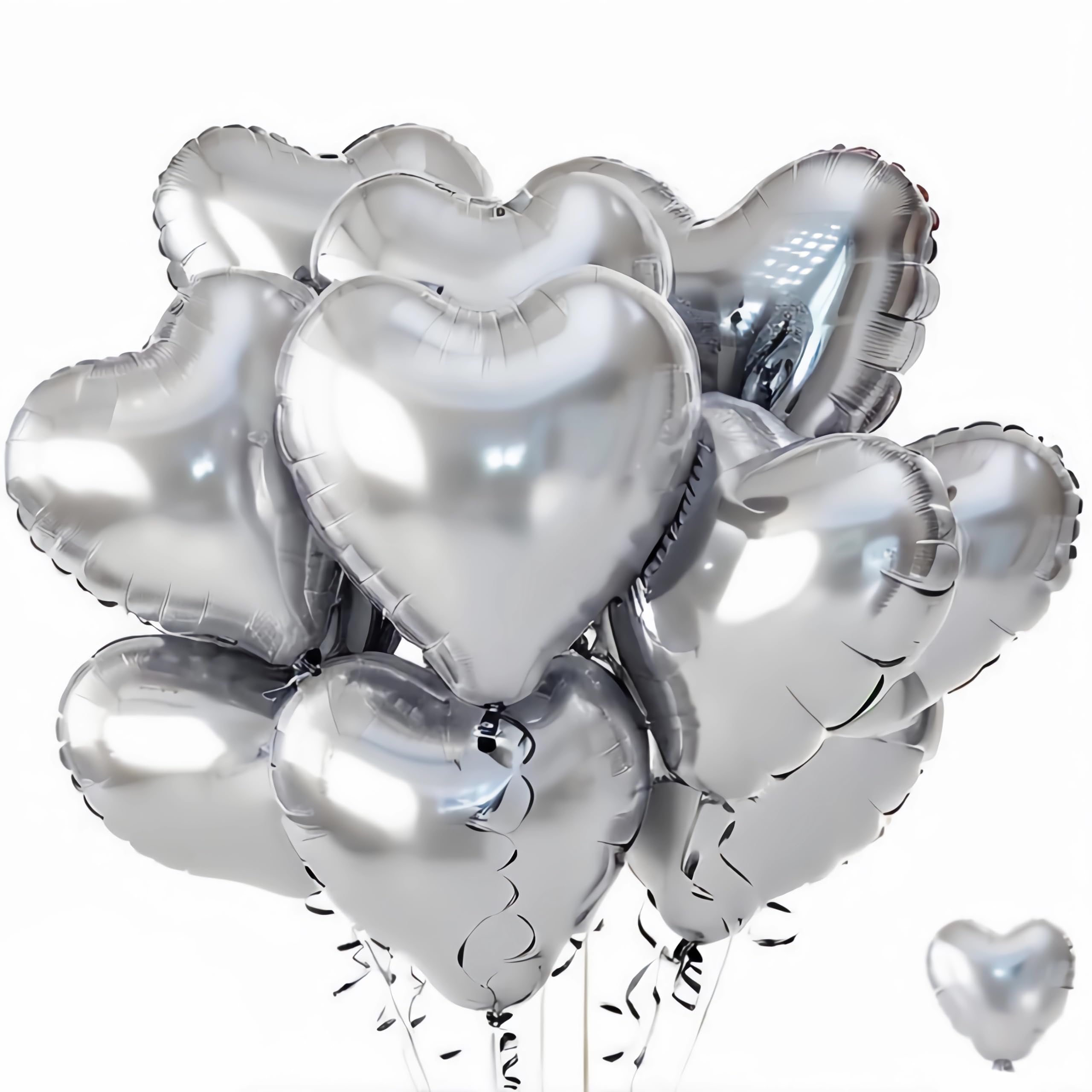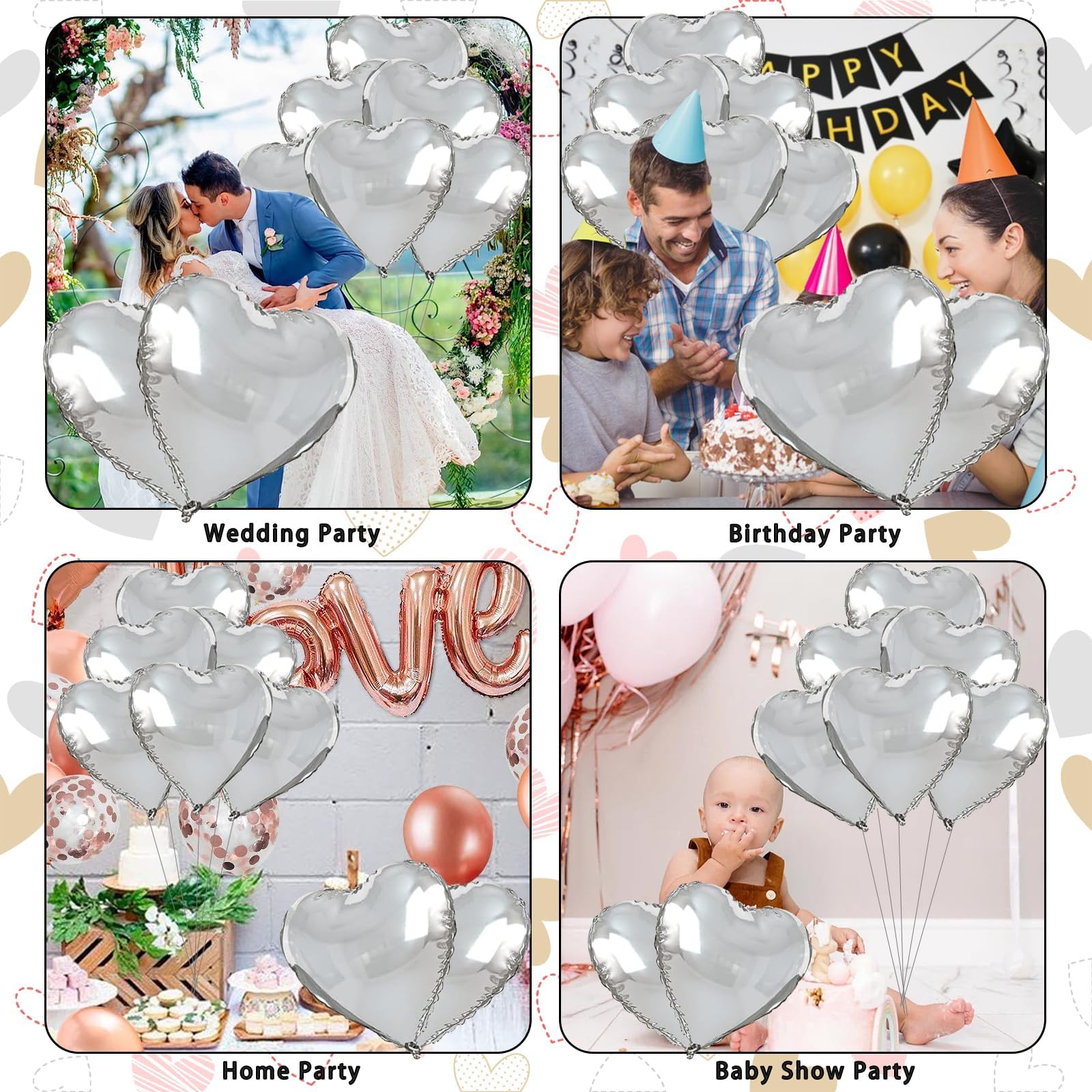 12 Silver Heart Balloons: The package includes 12 x 18 inch silver heart balloons with 1 ribbon. Silver foil heart-shaped balloons add a touch of fun and surprise to any party or holiday celebration. Their size is 18 inches, which is the perfect complement to your decoration needs, leaving unforgettable memories for your guests!