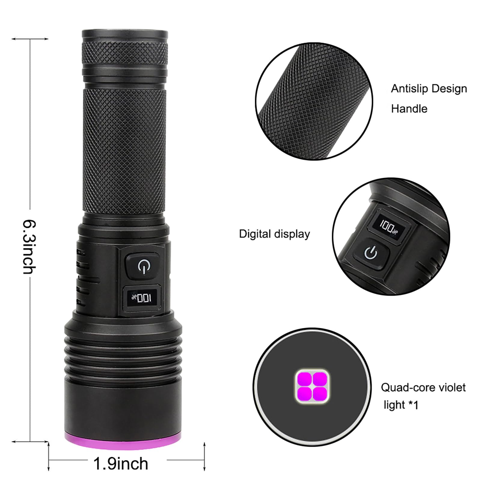 [USB-C Charging & Digital Display] This UV flashlight has a built-in 7000mAh large capacity battery, which can be fully charged in 3-4 hours and lasts for 10-12 hours. It supports USB direct charging, eliminating the need for complicated external chargers. The LED display accurately shows the battery level, ranging from 0% to 100%