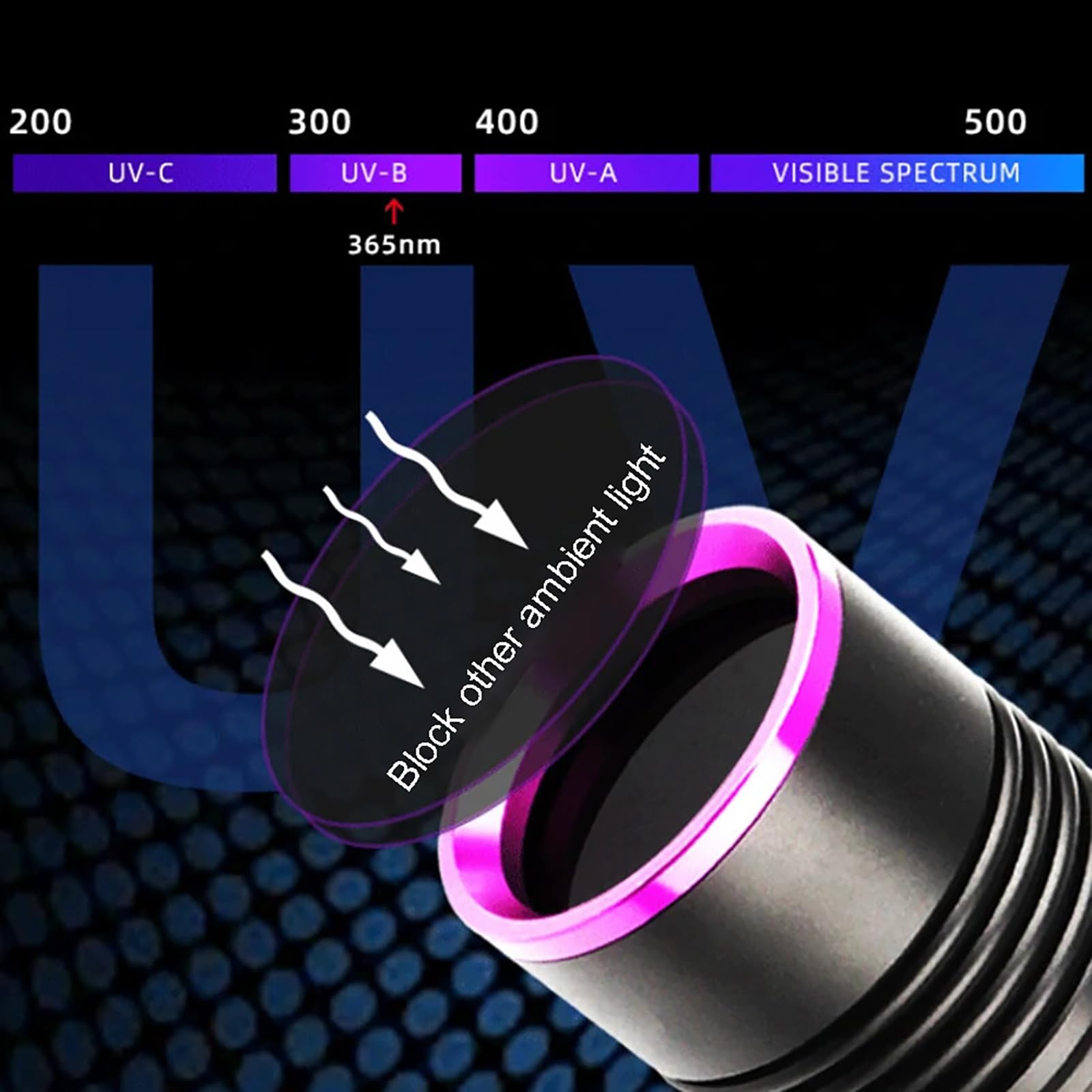 [365NM UV Light Source and Black Filter Lens] This UV flashlight is equipped with a specially designed black filter lens, effectively blocking unnecessary visible light and ensuring pure UV light for improved performance. Compared to 395-405nm UV flashlights, the 365NM wavelength provides more powerful UV light, with higher brightness and almost no visible light, outperforming traditional fluorescent lights