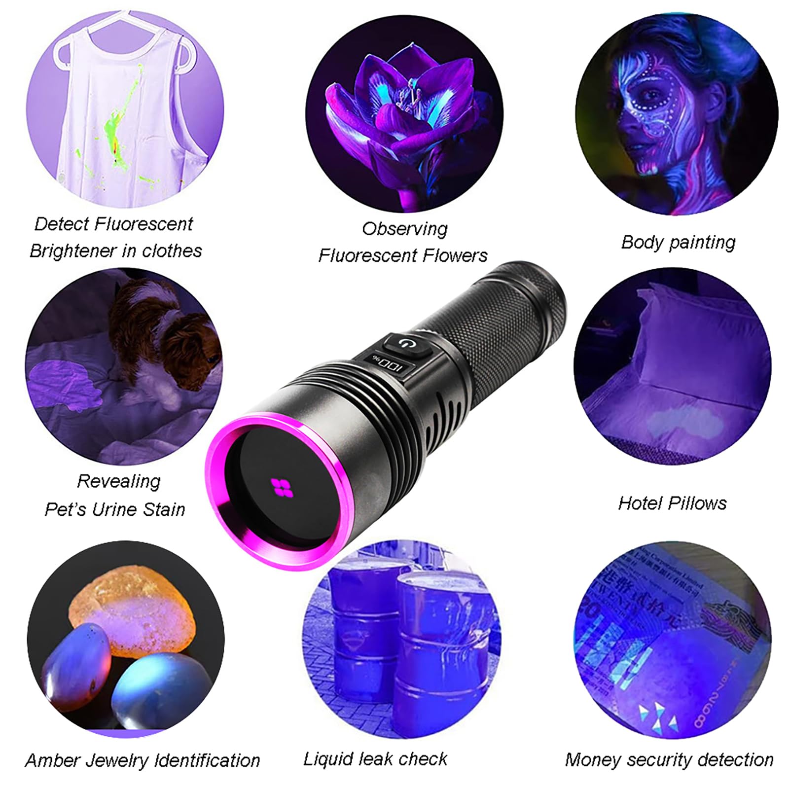 [Wide Range of Applications] Outdoor Adventures: Searching for rocks (such as Yooperlites, soda stones), scorpion hunting, mineral and insect searches, blood trail tracking;Home Detection: Pet urine inspection, ringworm/bed bug detection, hotel/bathroom/kitchen cleaning, food stains/fluorescent material detection;Professional Uses: UV resin curing, air conditioner leak detection, ID and currency authentication, uranium glass inspection, UV coatings, golf ball searches, etc