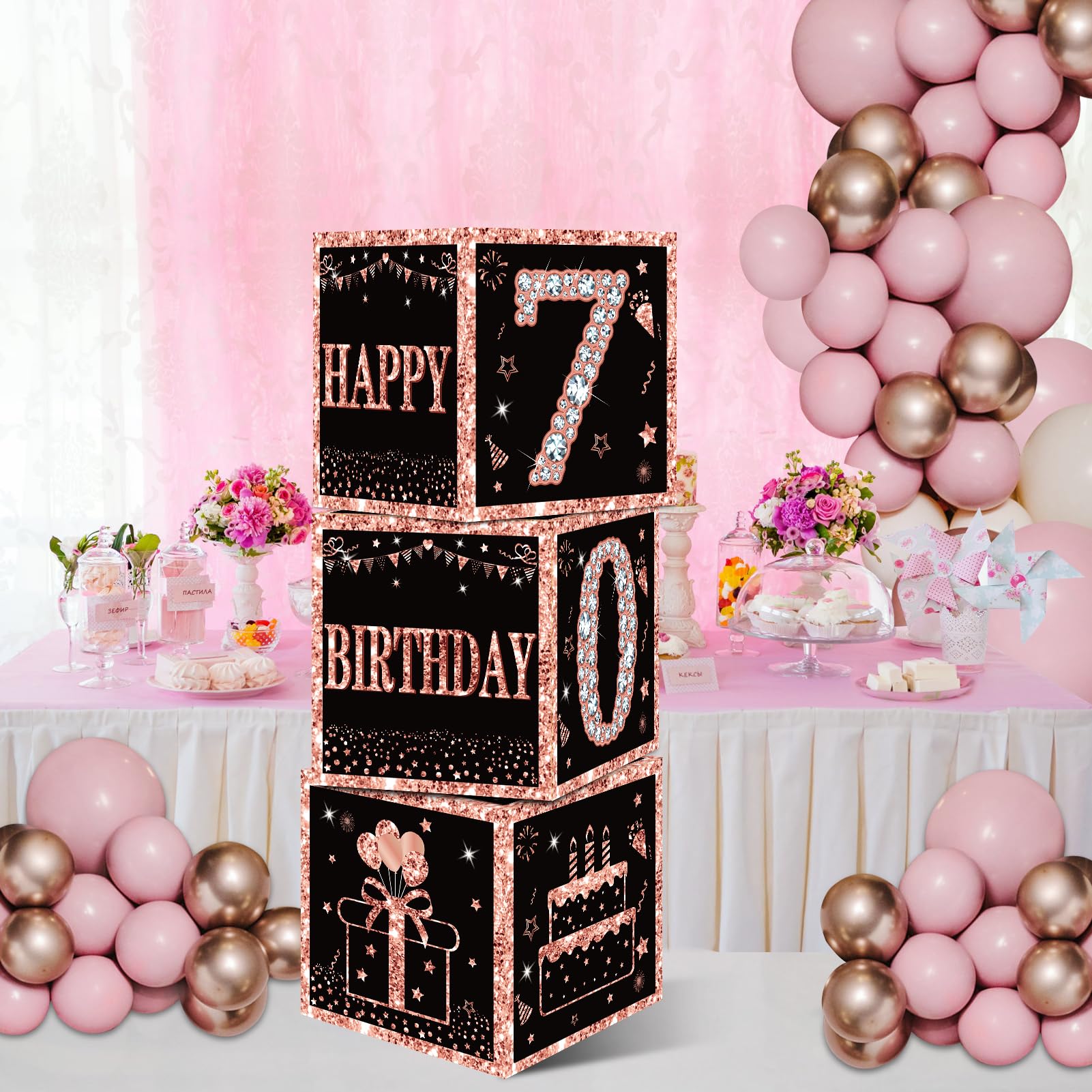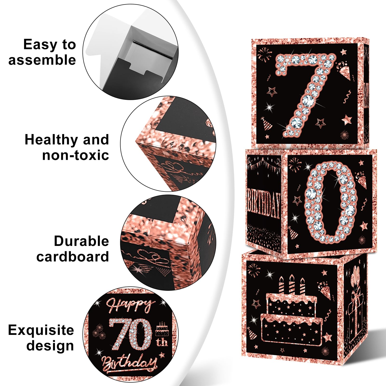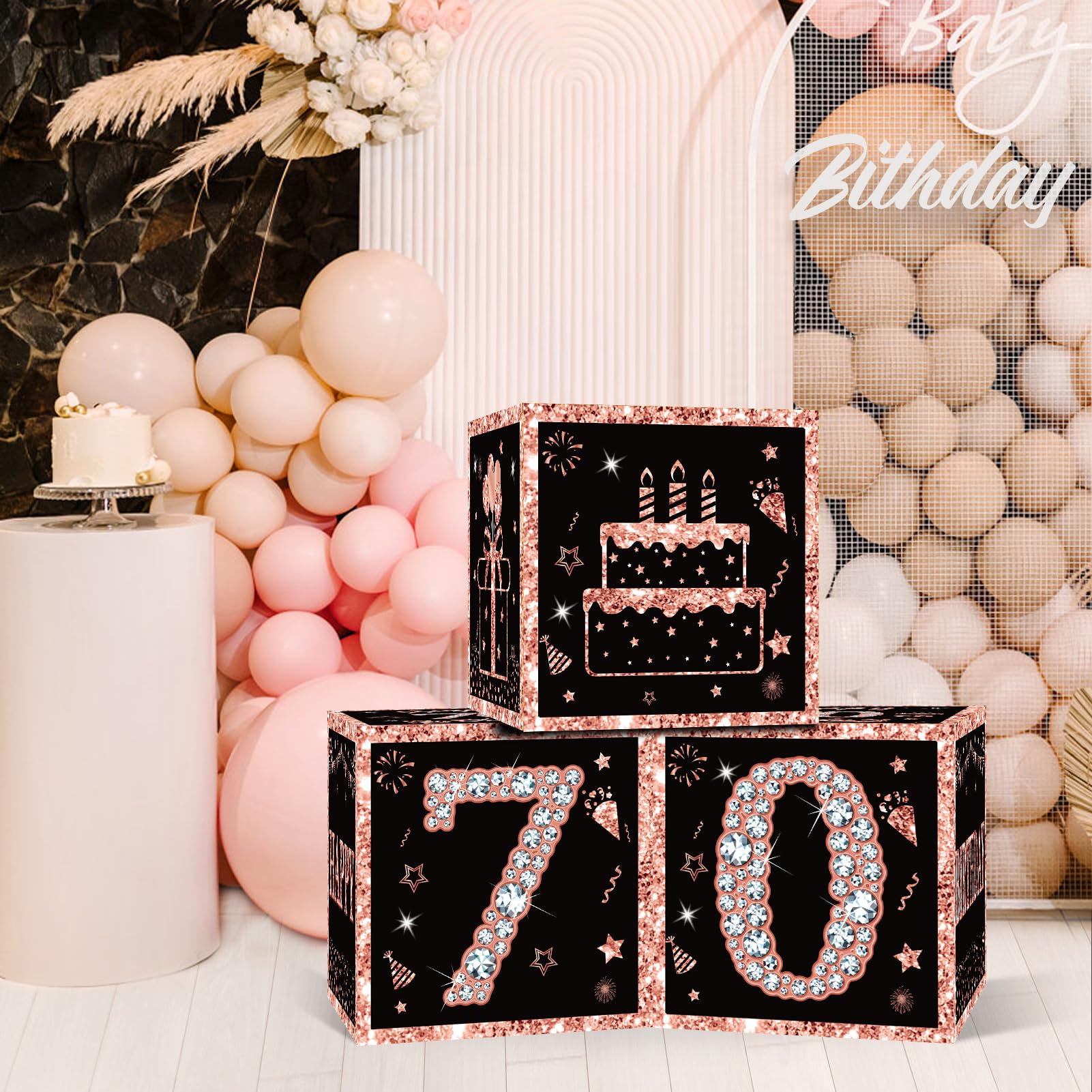 [You Will Receive] -3pcs rose gold 70th birthday balloon boxes decorations, the size of each box is 10.62×10.62×10.62inch. This set of great 70th birthday party display decorations. (Note: This set of decorations does not include balloons).