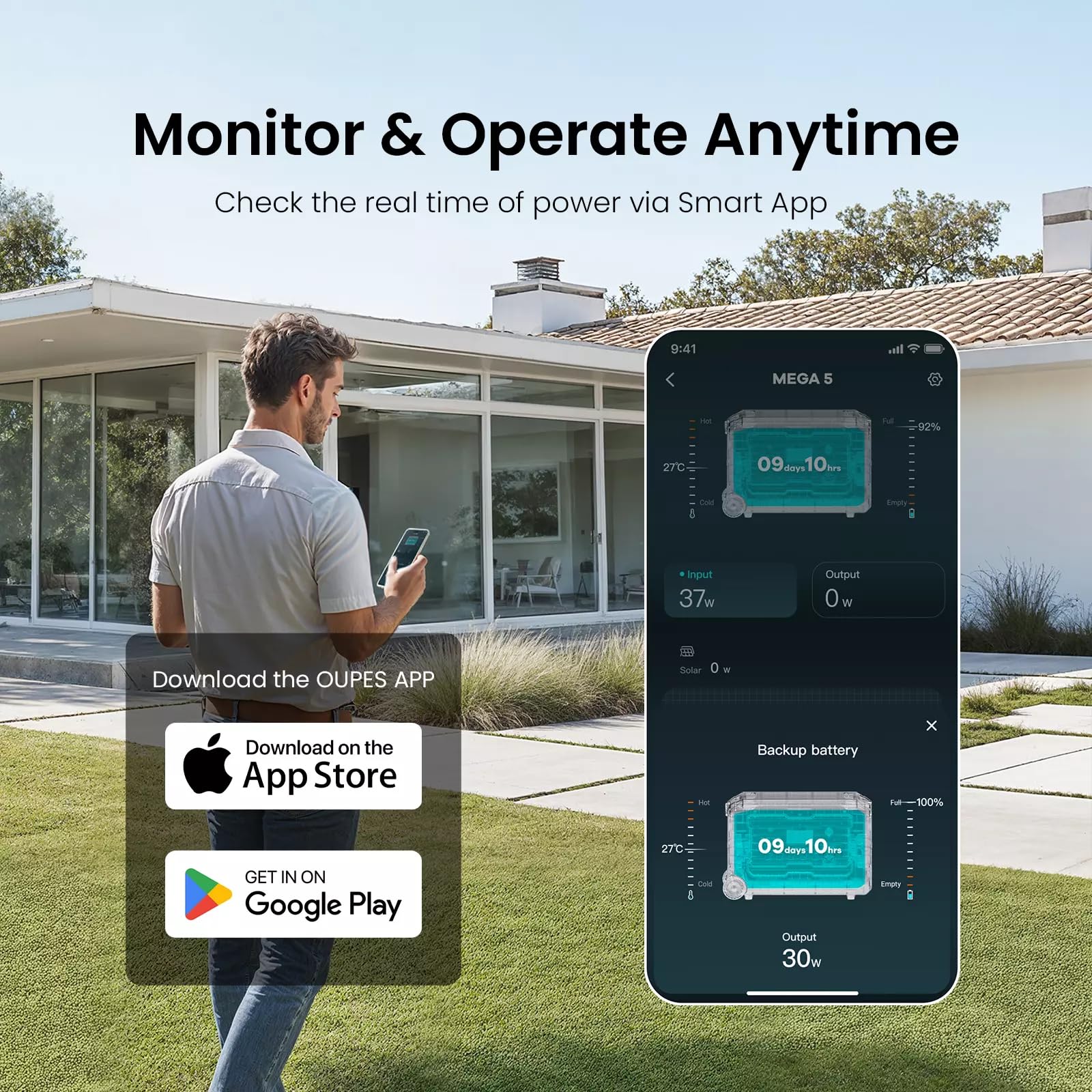 【Smart App Control】Using the OUPES app via Wi-Fi or Bluetooth. Monitor the real-time status (including remaining battery level, estimated running time, and input/output wattages) and customize the settings according to your needs.