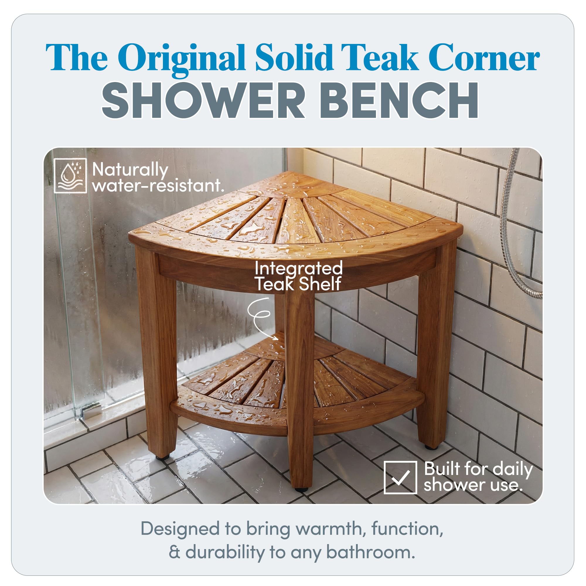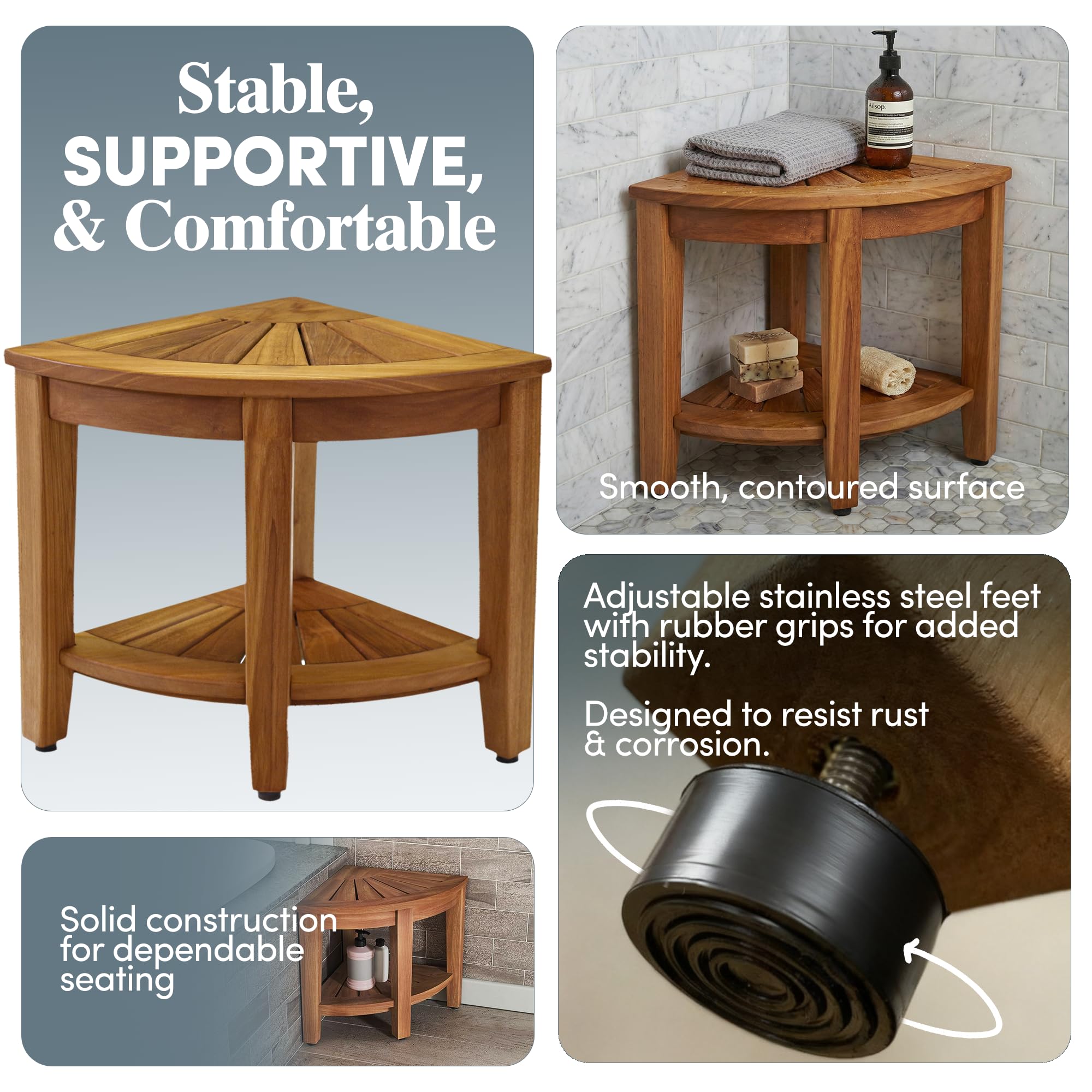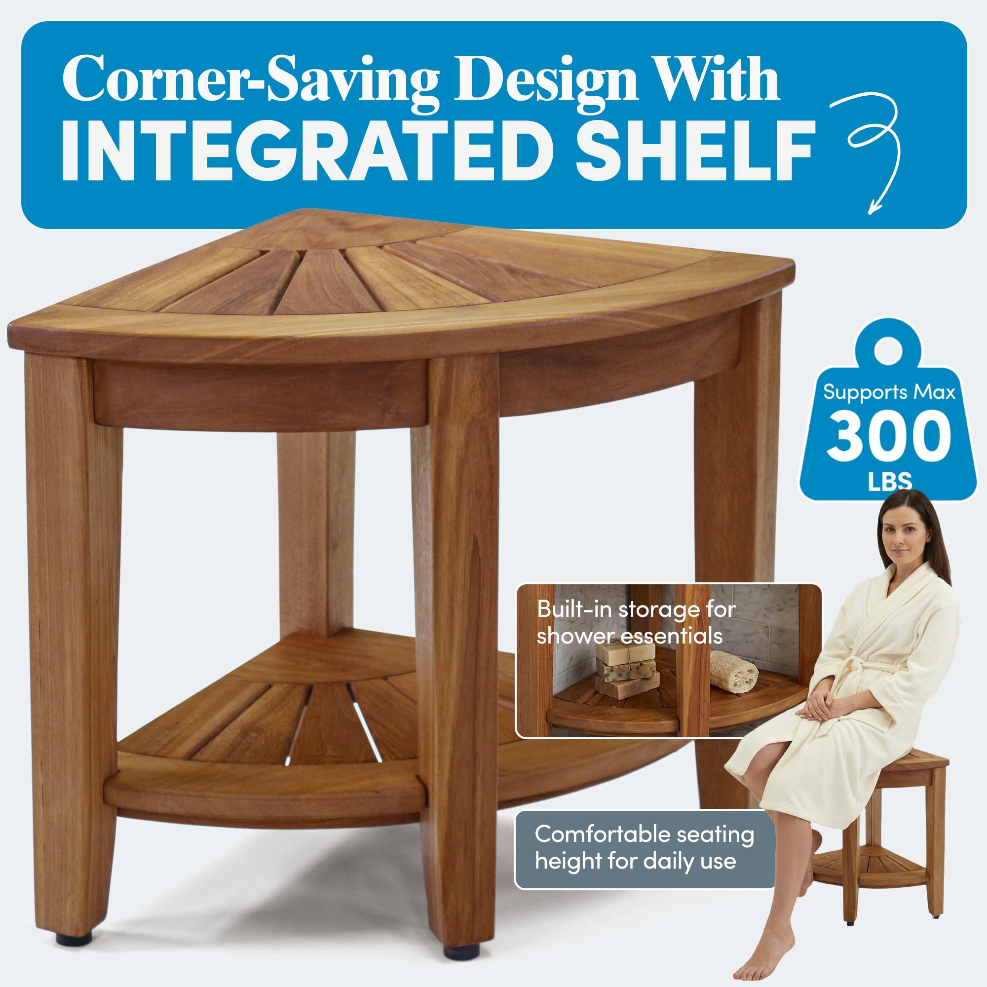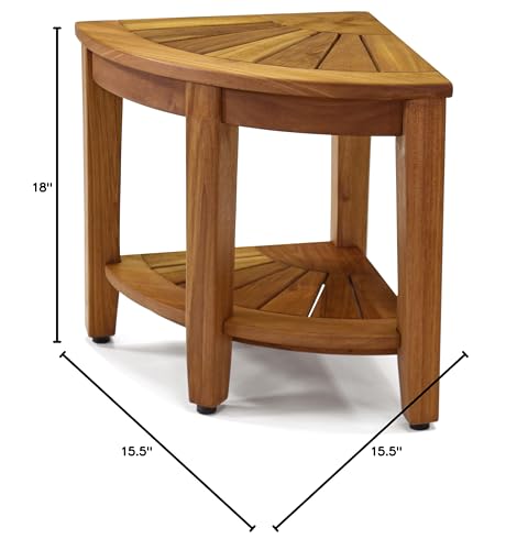 Smart Storage Design: Built with all stainless steel, non-corroding screws, this teak wood bench is built to last. Designed with a built-in corner shelf, it helps you organize your bathroom essentials. Keep your soaps, towels, or razors easily accessible while maintaining a clutter-free space. Ideal as a shower organizer or bathroom shelf, this bench maximizes both functionality and style.