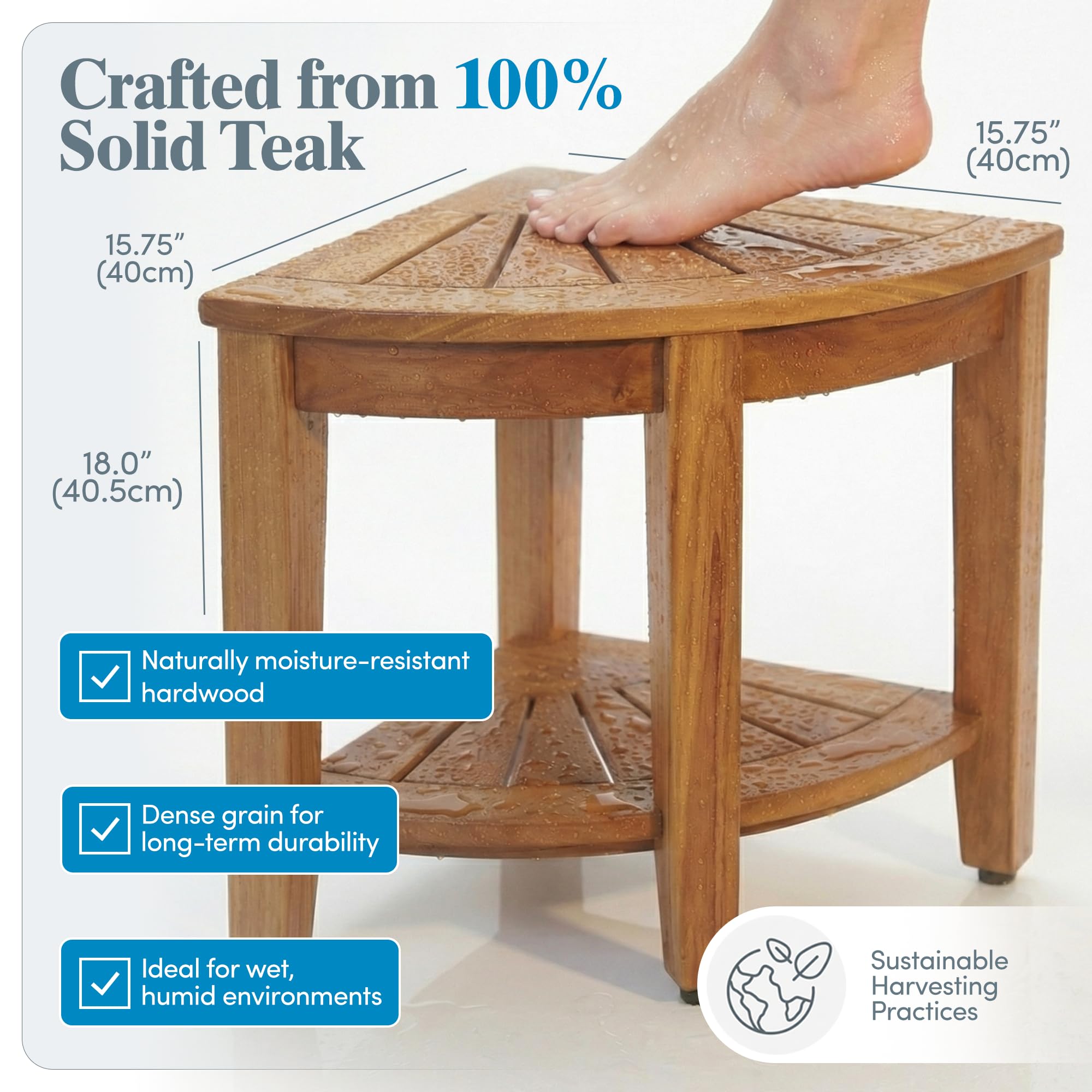 Premium Teak Wood for Durability: Crafted from sustainably harvested, premium Indonesian teak wood, this shower bench is designed to withstand humidity and resist water damage and allow water to flow through, preventing pooling & offering long-lasting performance. Ideal for bathroom furniture, this durable teak wood bench is the prime addition to your shower or bathroom decor.