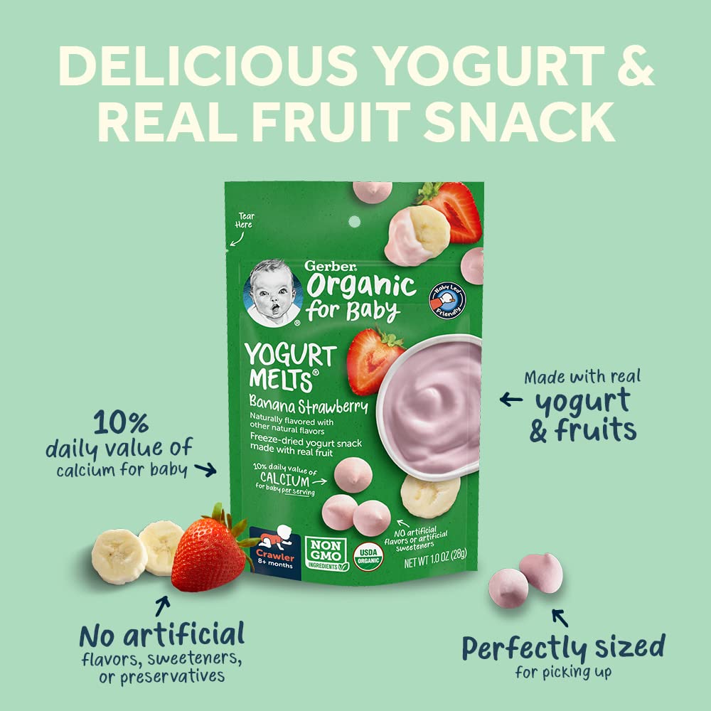 Nourish your little one with the goodness of Gerber Up Age 7ct organic variety snack pack. These tasty snacks combine the delicious taste little ones love with the wholesome nutrition parents love. Contains 2 -1.48oz fig berry organic Puffs, 2 -1.48oz Cranberry Orange Organic Puffs, 2 -1oz Strawberry Banana organic yogurt melts, 1 -1oz red berry organic yogurt melts.