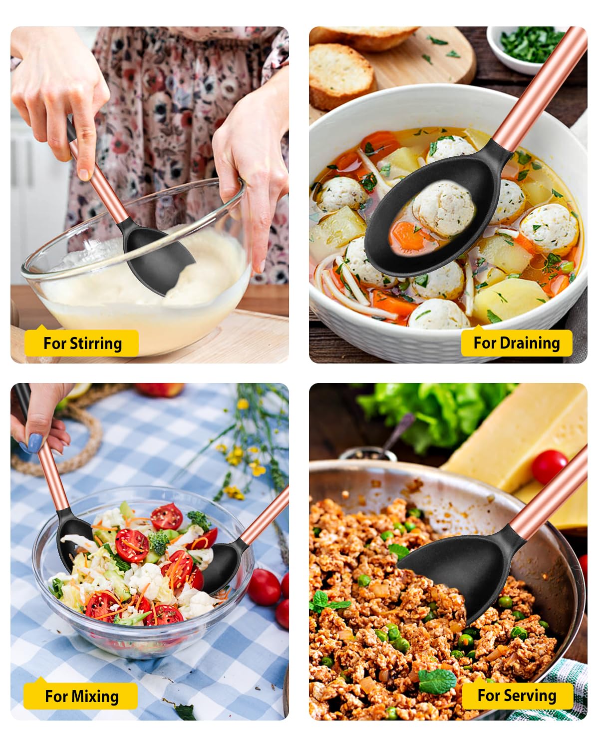Just Want To Provide The Ideas For You : Large cooking spoon used to hold food more convenient; Slotted Spoon can quickly drain the water; Whether it is used for draining or serving food, our large silicone cooking spoon will add more fun to your kitchen
