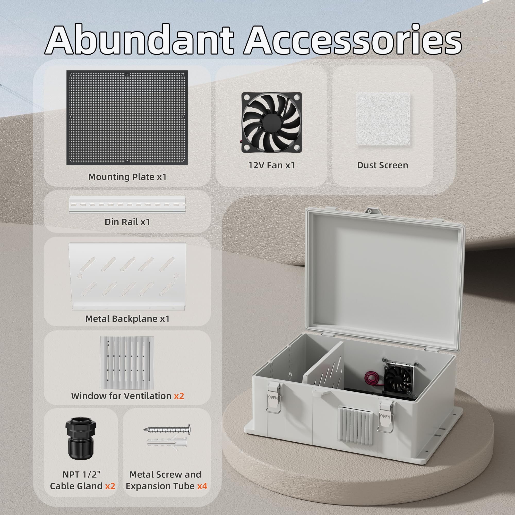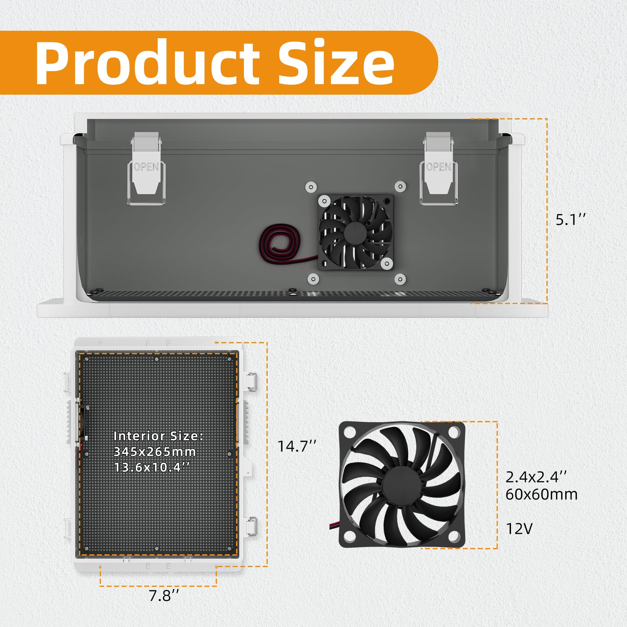 Effective Ventilation & Cooling - The outdoor electrical box comes with a 12v fan and two generously proportioned heat dissipation apertures on its flanks. Once the fan is connected to the power source, it can dissipate heat on its own, ensuring the safe operation of your devices